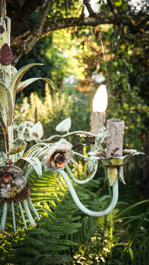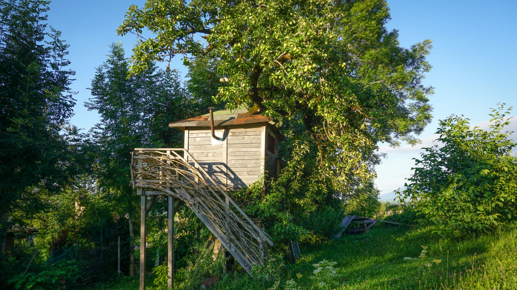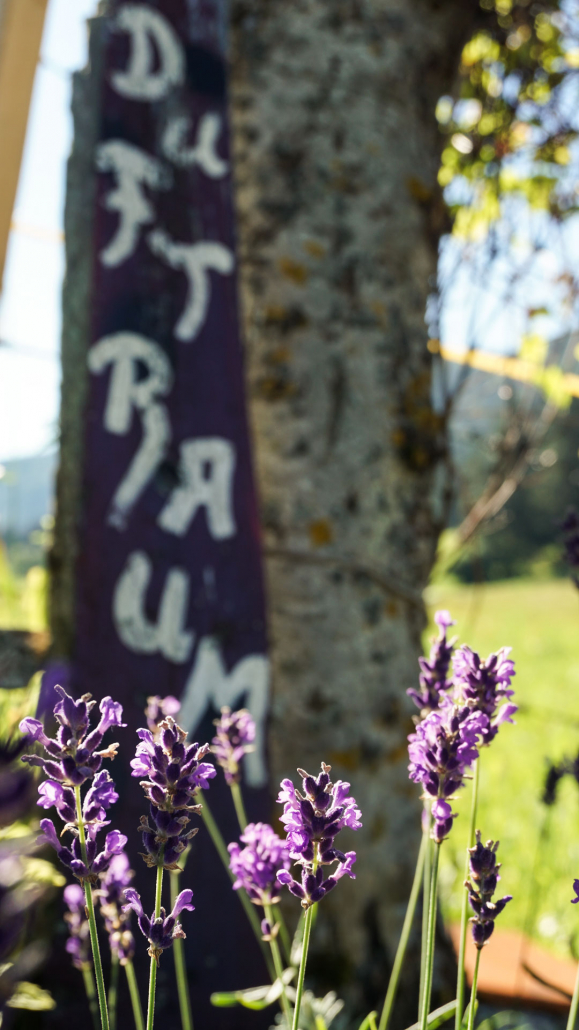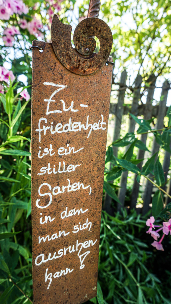 Immer wieder setzt Familie Kamm neue, ungewöhnliche Akzente in ihrem Wohlfühlgarten um. Zum Beispiel das Baumhaus – mit Feuerstelle und Glocke – das ihr Sohn selbst gebaut hat und das selbst Erwachsene zwischen Holz- und Apfelduft auf ganz neue Ideen bringt. Zeit, um etwas Neues einzuläuten. An vielen Ecken gibt es die Gelegenheit, seine Aufmerksamkeit auf kleine Details zu richten und so zur Ruhe zu kommen. Diese regen dazu an, den Raum hinter dem Sichtbaren aufzumachen. Der Kerzenleuchter, der an einem Holunderast hängt oder ein Glas mit Pusteblumen, die in der Sonne wie weiche Wattebäusche wirken. „Die Menschen kommen ins Allgäu, radeln, wandern und schauen sich die Sehenswürdigkeiten an. Ein volles Programm – fast wie im Alltag, nur eben in der Freizeit. Klar, ist das schön, möglichst viel zu sehen, aber was passiert eigentlich, wenn ich mir mal einfach so ein Detail anschaue und darüber nachdenke?“