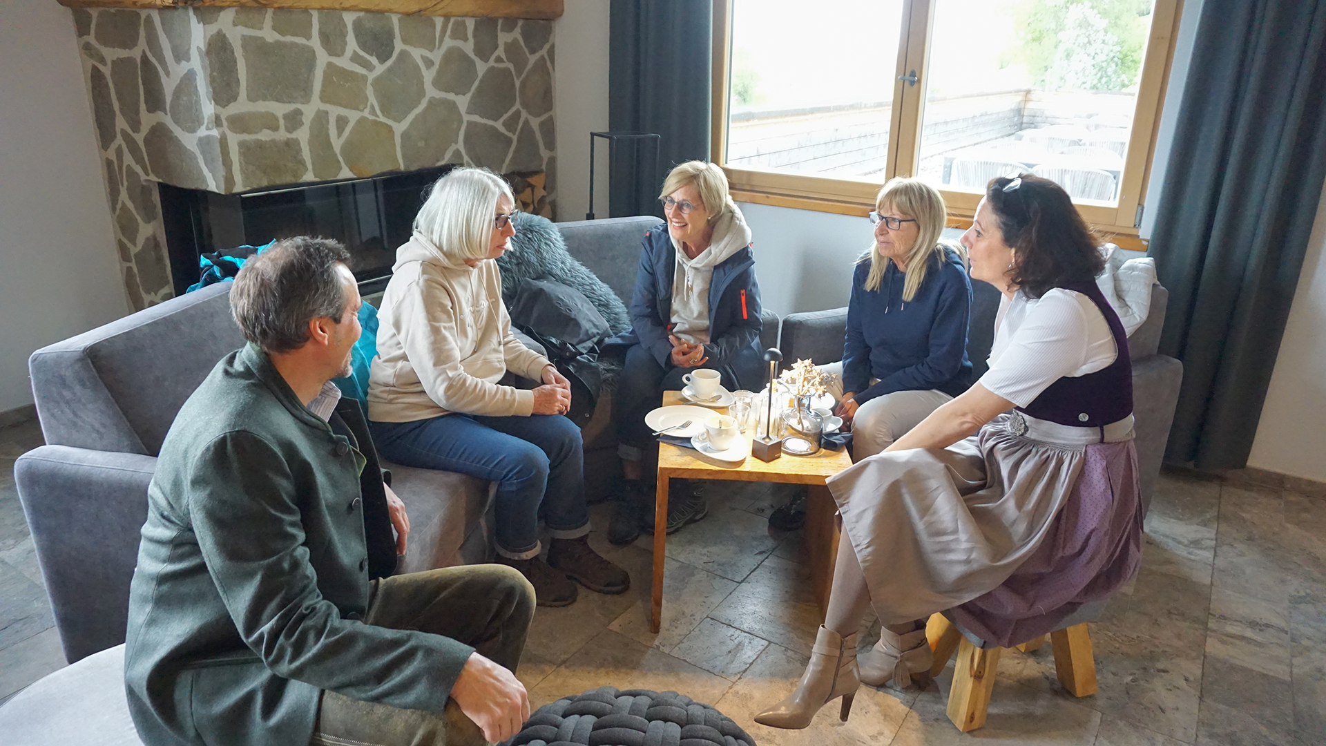 Auch ihre Gäste sind für das Gastgeberpaar ein Teil der großen Familie. Mit einem ausgeklügelten Dienstplan sorgen sie dafür, dass die einzelnen Mitarbeitenden möglichst lange den gleichen Gast betreuen und so eine Bindung entstehen kann. Und auch die beiden Hoteliers selbst sitzen gerne mal für einen kleinen „Hoigarte“ mit ihren Stammgästen zusammen, sofern es ihre Zeit erlaubt. Diese drei Damen aus Kirchheim an der Teck haben sich eine Wanderauszeit genommen und waren schon mehrmals in Hartungs Hoteldorf. Rund fünfundzwanzig Prozent der Urlauber sind Stammgäste.