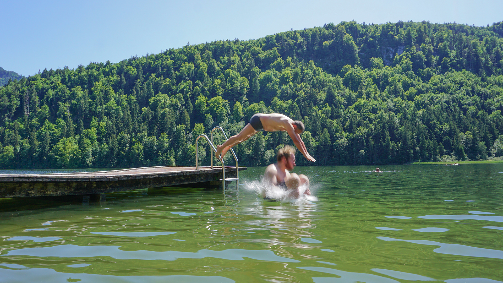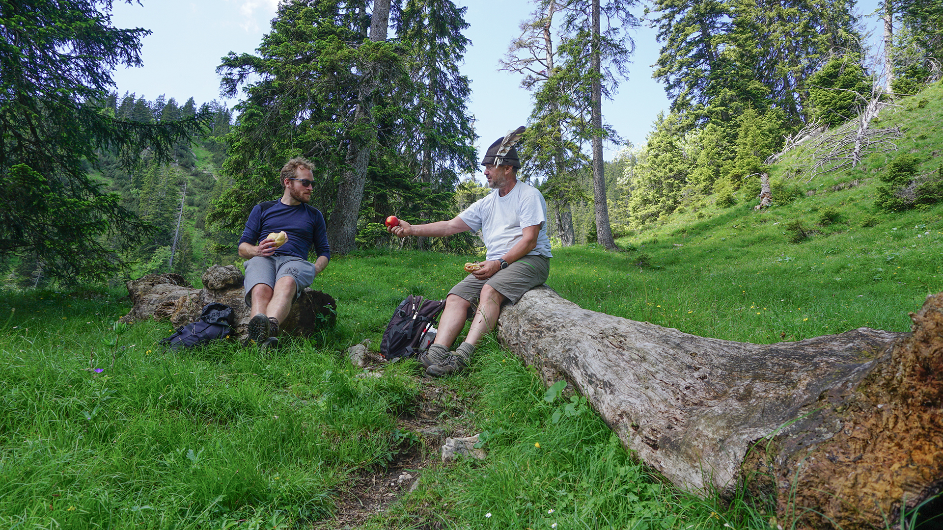 Eine kleine Pause, noch ein paar kurze Stopps zwecks Kehrarbeiten, die Materialien zurück ins Lager der Fritz-Putz-Hütte bringen, dann ist der Arbeitseinsatz für Peter und Tim heute beendet. Mit den CubaBoarischen geht es zurück ins Tal – mit Badestopp am Schwanseepark, denn wer so fest geschafft hat, hat sich eine Abkühlung im Schwansee redlich verdient.