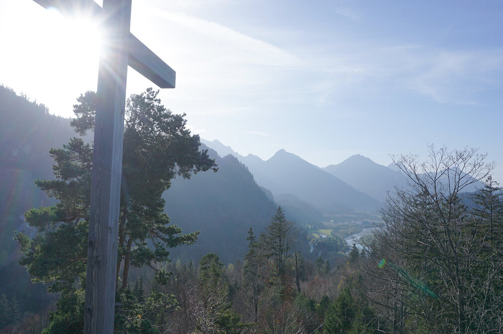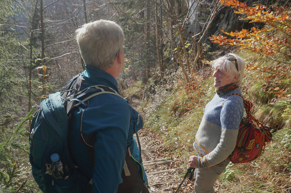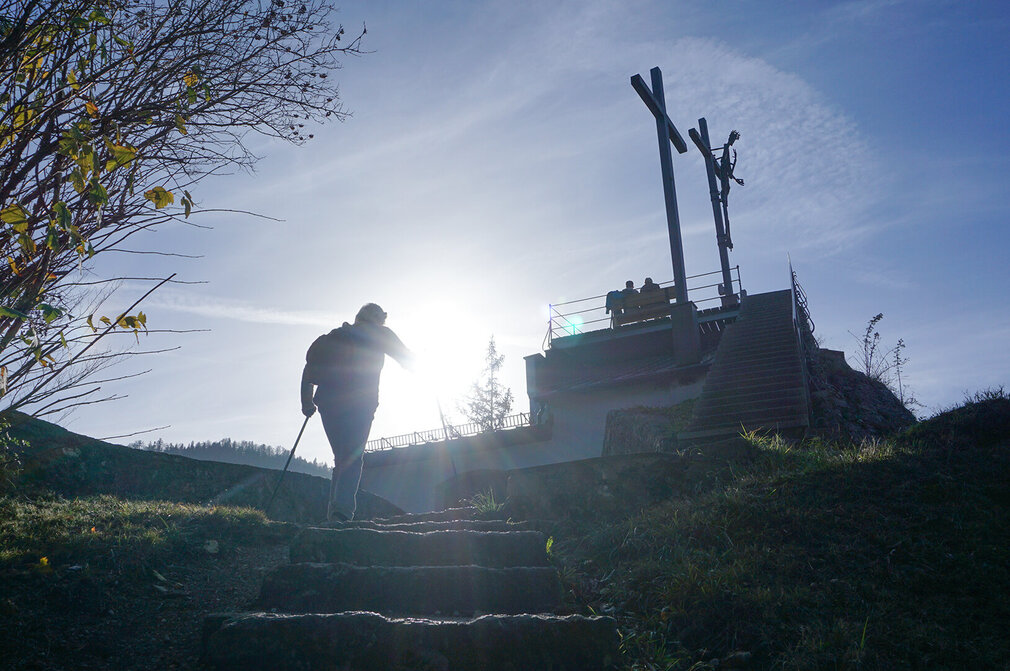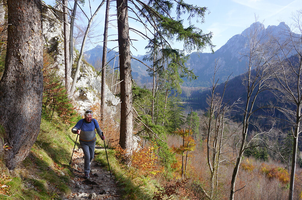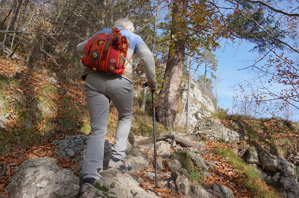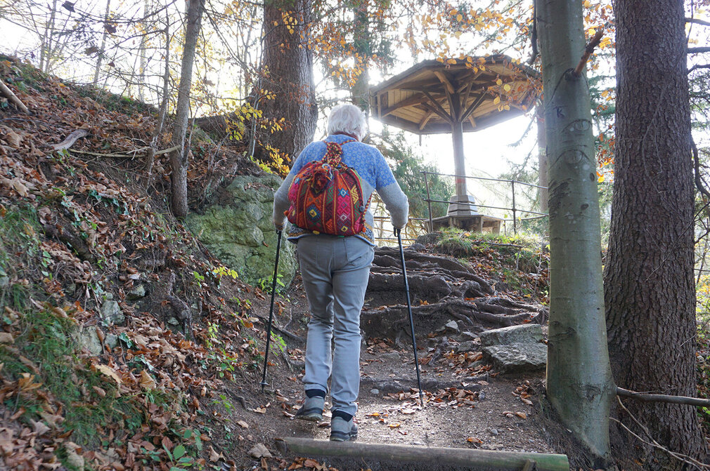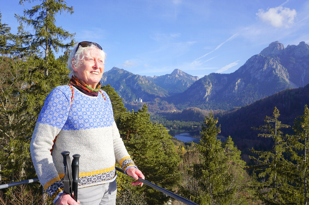 Kaiserwetter für eine Bergsteigerin. Inge Jäger geht am liebsten der Sonne entgegen. Die 83-Jährige wohnt in Füssen oberhalb des grünen Lechs in einem malerischen Altstadthaus, nur wenige Minuten vom Lechfall entfernt. „Von hier kann ich auf dem Alpenrosenweg zum Alpsee laufen, ins Faulenbacher Tal zum Alatsee oder nach Pinswang ins benachbarte Tirol. Das ist toll, wenn ich von der Haustür weg in alle Richtungen gehen kann." Heute hat sie sich den Kalvarienberg über die Südflanke vorgenommen, „weil es dort im Herbst und Winter mehr Sonne hat", meint die Wahl-Füssenerin.
