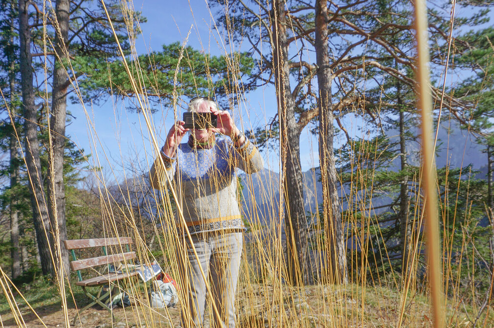 Die Bergsteigerin freut sich schon beim Rucksackpacken darauf, was ihr der Tourentag alles bringen wird. Berge sind für sie Seelenbalsam. „Ich werde dort ruhiger. Daheim denke ich mehr über Dinge nach, draußen ist mir viel wohler." Mit ihrer Kamera oder dem Handy hält sie gerne die schönsten Momente fest und schickt sie ihrer Enkelin. Auch Schnee und Eis halten die 83-Jährige nicht vom Draußensein ab, da läuft sie mit Schneeschuhen zum Dreiländereck mit seiner tollen Aussicht über das Füssener Land hinauf oder fährt ins Tannheimer Tal oder ins Lechtal hinüber. „Aber wegen der Umwelt habe ich ein schlechtes Gewissen, mit dem Auto unterwegs zu sein. Da schaue ich lieber, dass ich von daheim aus zu Fuß oder mit dem Rad zu meinem Ausgangspunkt gelange."