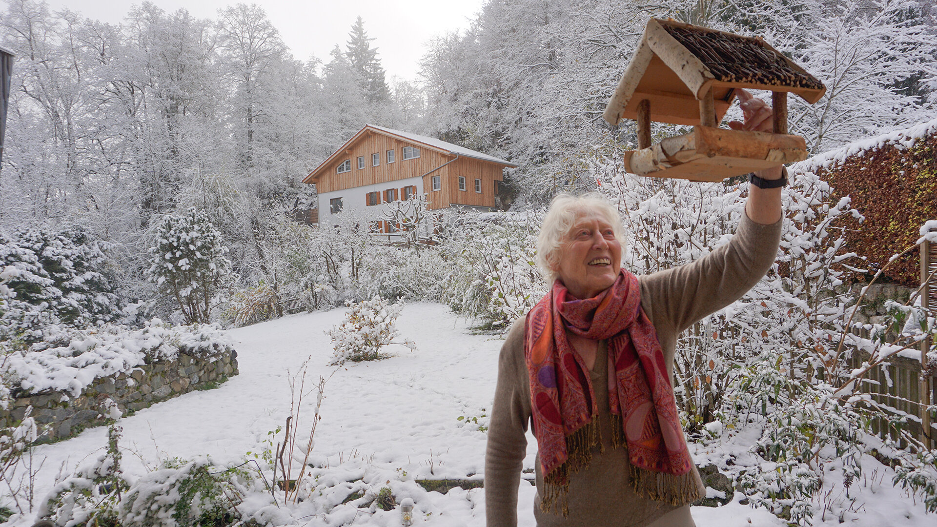Mittlerweile ist es Winter in Füssen: Inge Jäger füttert ihre Vögel im Garten und wünscht sich, noch viel in den Bergen unterwegs sein zu können. Ihre Eltern blieben dem Bergsteigen bis in hohe Alter treu - immer begleitet von ihren Dackeln. Die wurden notfalls auch im Rucksack weitergetragen, wenn der Weg zu steil oder unwegsam war.