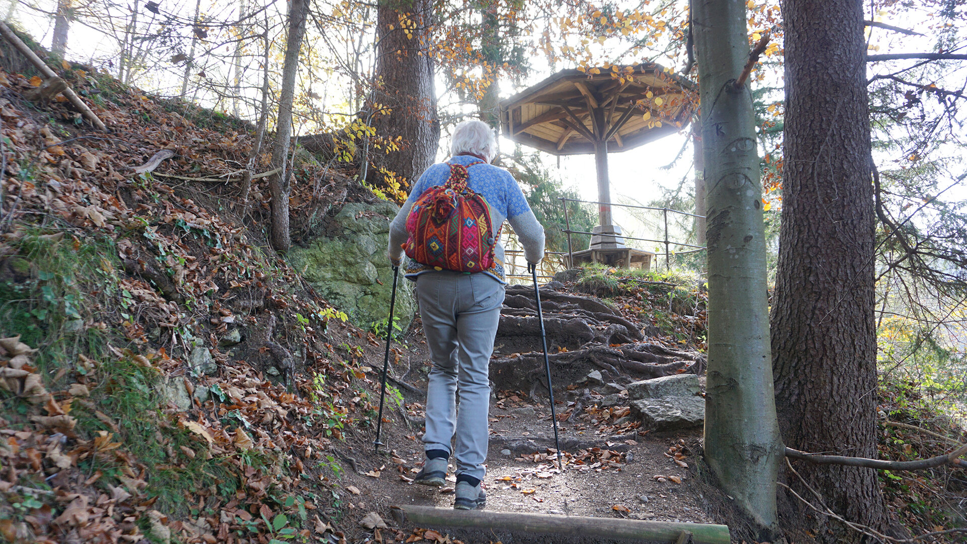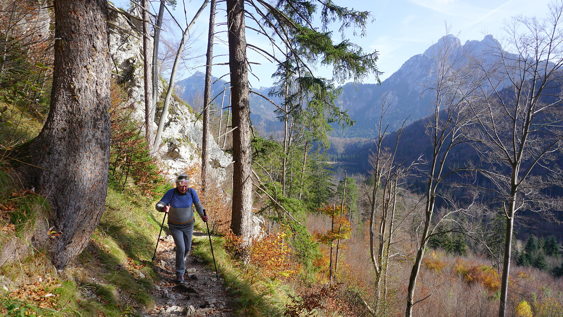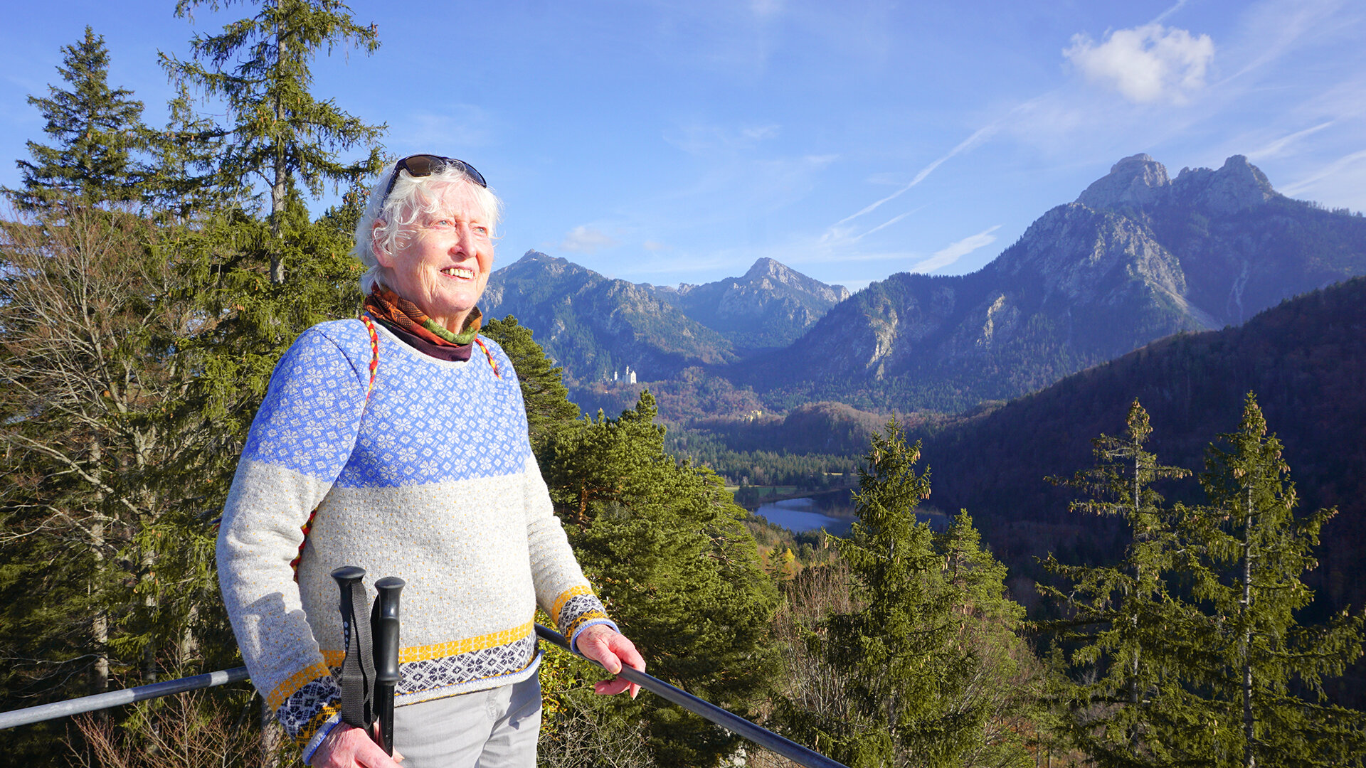 Kaiserwetter für eine Bergsteigerin. Inge Jäger geht am liebsten der Sonne entgegen. Die 83-Jährige wohnt in Füssen oberhalb des grünen Lechs in einem malerischen Altstadthaus, nur wenige Minuten vom Lechfall entfernt. „Von hier kann ich auf dem Alpenrosenweg zum Alpsee laufen, ins Faulenbacher Tal zum Alatsee oder nach Pinswang ins benachbarte Tirol. Das ist toll, wenn ich von der Haustür weg in alle Richtungen gehen kann." Heute hat sie sich den Kalvarienberg über die Südflanke vorgenommen, „weil es dort im Herbst und Winter mehr Sonne hat", meint die Wahl-Füssenerin.