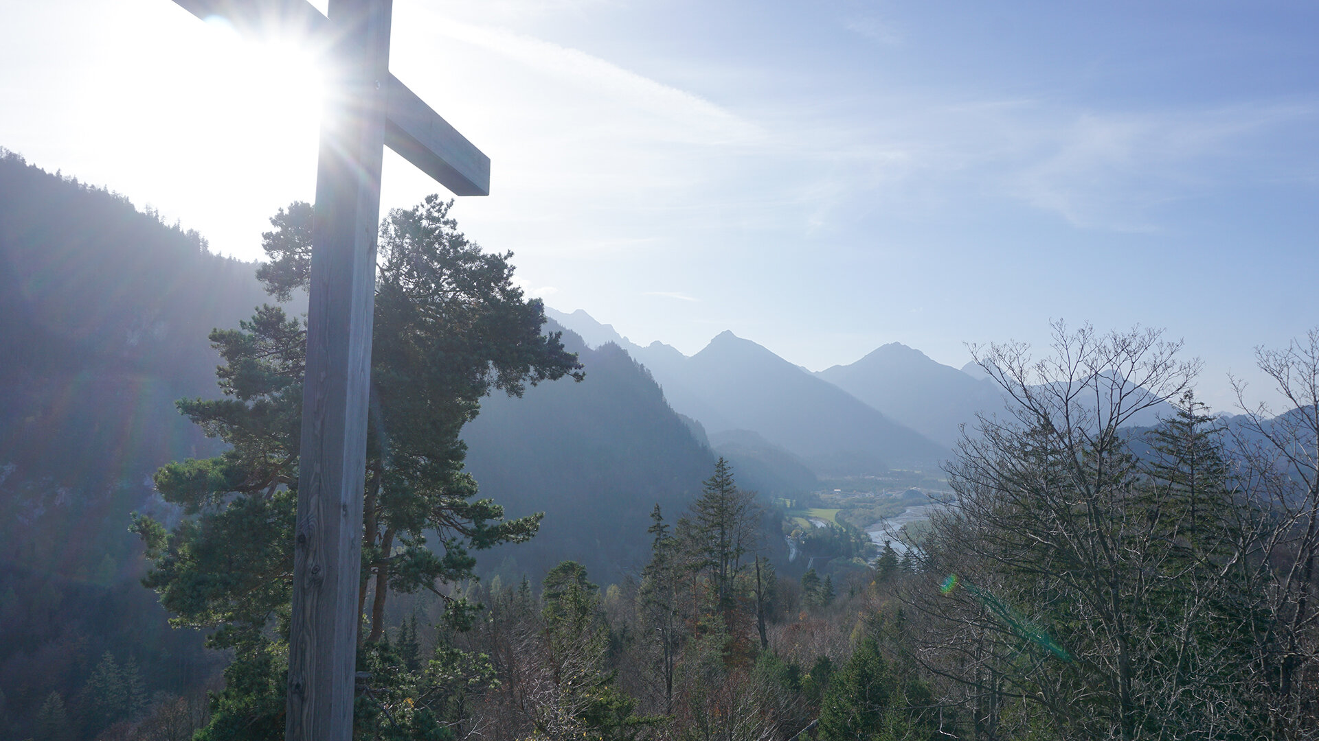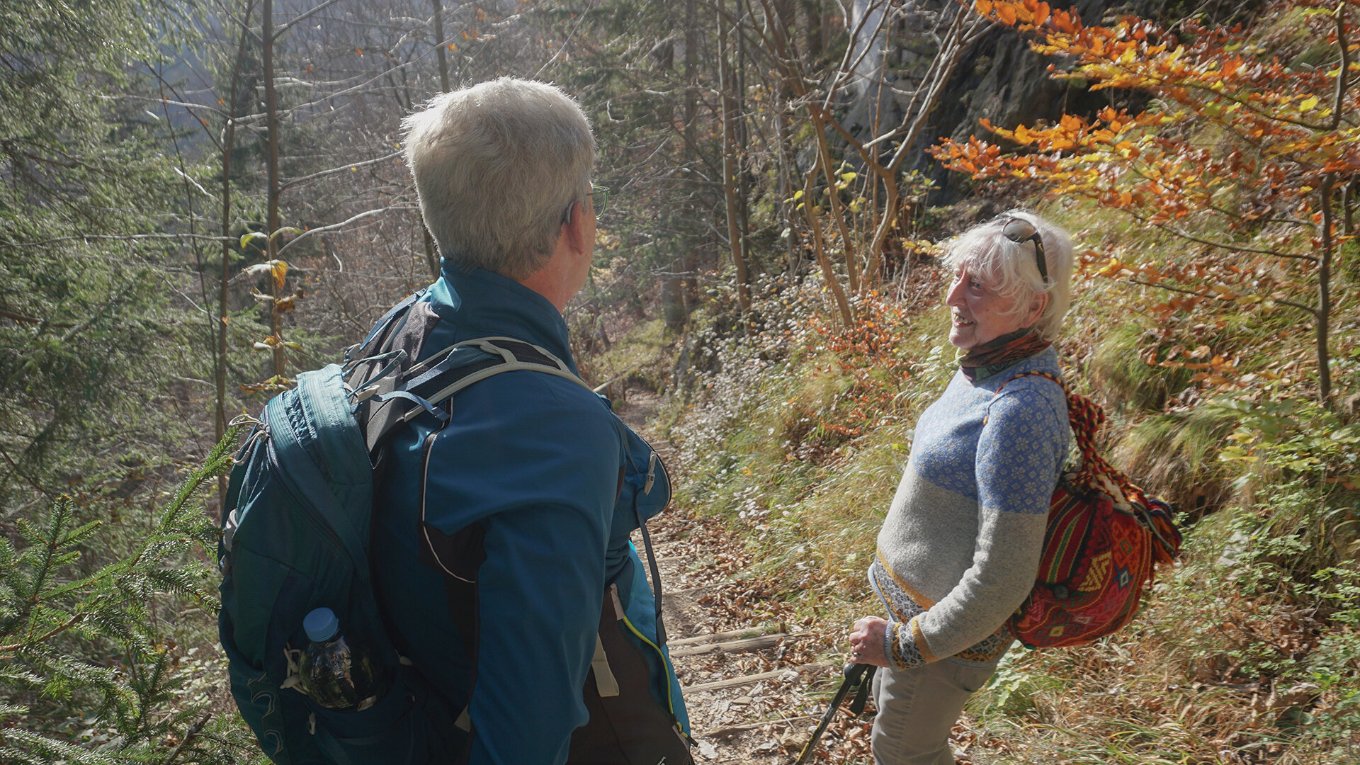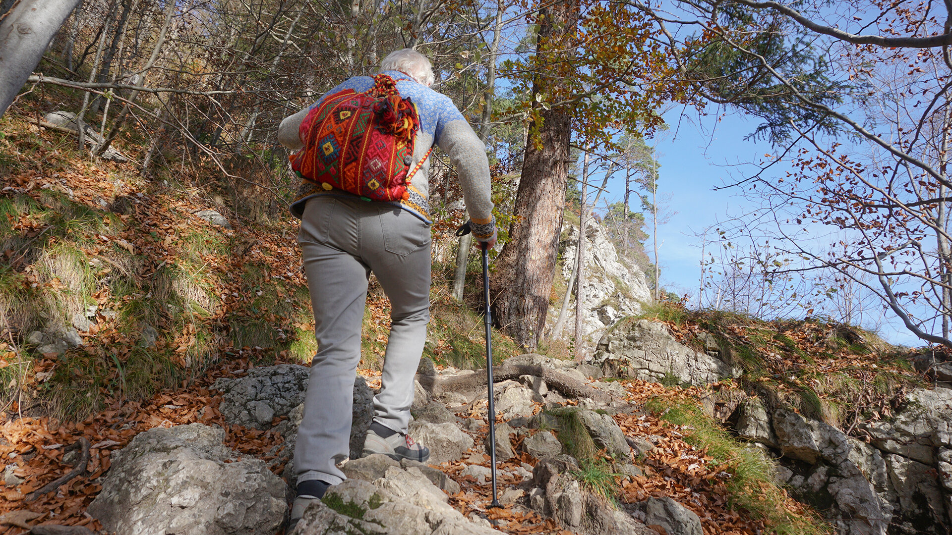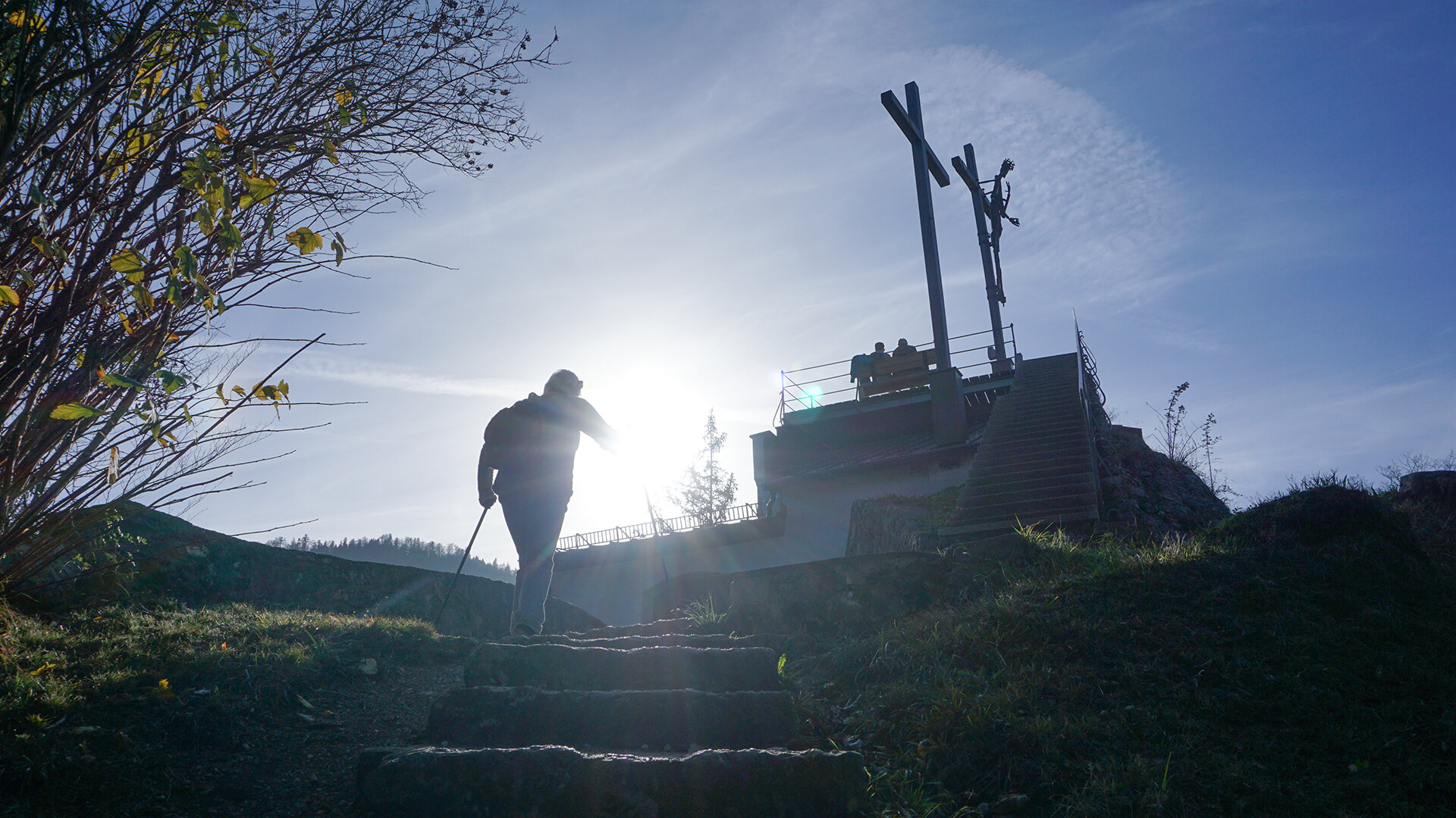 Kaiserwetter für eine Bergsteigerin. Inge Jäger geht am liebsten der Sonne entgegen. Die 83-Jährige wohnt in Füssen oberhalb des grünen Lechs in einem malerischen Altstadthaus, nur wenige Minuten vom Lechfall entfernt. „Von hier kann ich auf dem Alpenrosenweg zum Alpsee laufen, ins Faulenbacher Tal zum Alatsee oder nach Pinswang ins benachbarte Tirol. Das ist toll, wenn ich von der Haustür weg in alle Richtungen gehen kann." Heute hat sie sich den Kalvarienberg über die Südflanke vorgenommen, „weil es dort im Herbst und Winter mehr Sonne hat", meint die Wahl-Füssenerin.
