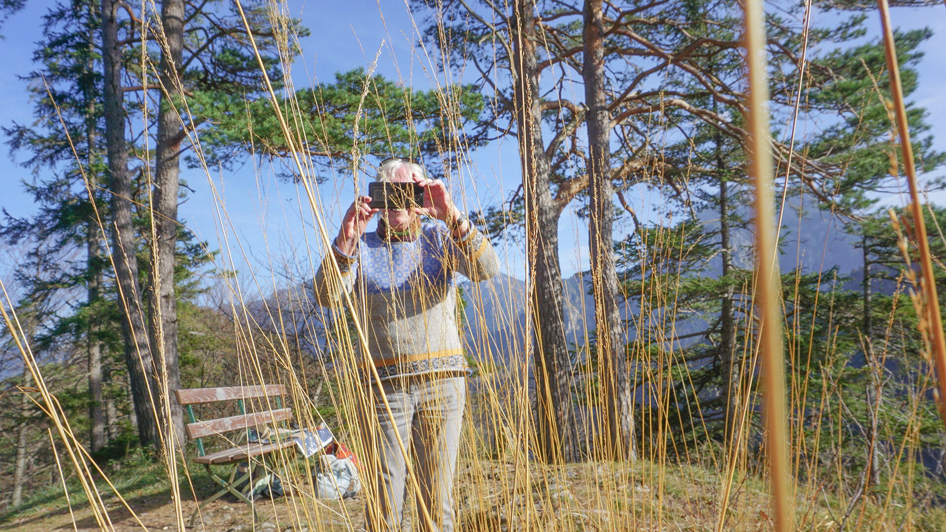 Die Bergsteigerin freut sich schon beim Rucksackpacken darauf, was ihr der Tourentag alles bringen wird. Berge sind für sie Seelenbalsam. „Ich werde dort ruhiger. Daheim denke ich mehr über Dinge nach, draußen ist mir viel wohler." Mit ihrer Kamera oder dem Handy hält sie gerne die schönsten Momente fest und schickt sie ihrer Enkelin. Auch Schnee und Eis halten die 83-Jährige nicht vom Draußensein ab, da läuft sie mit Schneeschuhen zum Dreiländereck mit seiner tollen Aussicht über das Füssener Land hinauf oder fährt ins Tannheimer Tal oder ins Lechtal hinüber. „Aber wegen der Umwelt habe ich ein schlechtes Gewissen, mit dem Auto unterwegs zu sein. Da schaue ich lieber, dass ich von daheim aus zu Fuß oder mit dem Rad zu meinem Ausgangspunkt gelange."