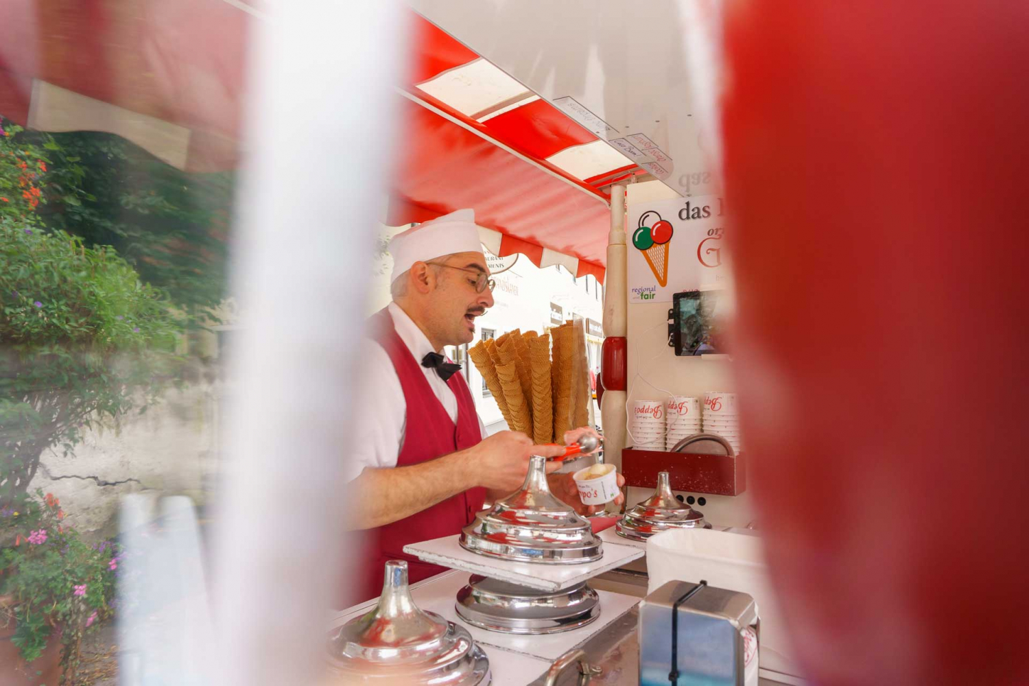 Wo der Gelatiere auftaucht, wird er schnell zum Mittelpunkt. Nicht nur wegen seiner eiskalten Köstlichkeiten. Vielmehr geht es um die Begegnung. Sie ist das, was ihn letztendlich antreibt. „Wenn richtiges Gelatieriwetter ist, dann lacht mein Herz, weil die Menschen gut drauf sind. Ich liebe die Sonne, ich liebe die Begegnung. Von arm bis reich, von jung bis alt – bei mir geht es nicht um die Position, die eine Person innehat, sondern um den Menschen, den ich in diesem kurzen Augenblick begegnen darf.“ Manch einen nimmt er ein Stück auf dem Fahrersitz mit und wechselt spontan seine Rolle vom Eisverkäufer zum Gästeführer. Dann gibt er Tipps, was „Gast“ unbedingt gesehen haben sollte und macht Werbung für einen längeren Aufenthalt in der Stadt. „Ich mag Füssen einfach. Die ganze Welt ist hier zu Gast und trotzdem ist es klein und überschaubar.“