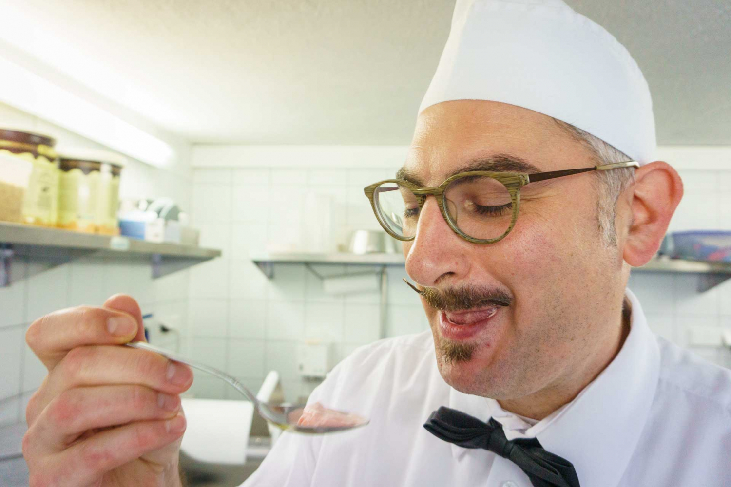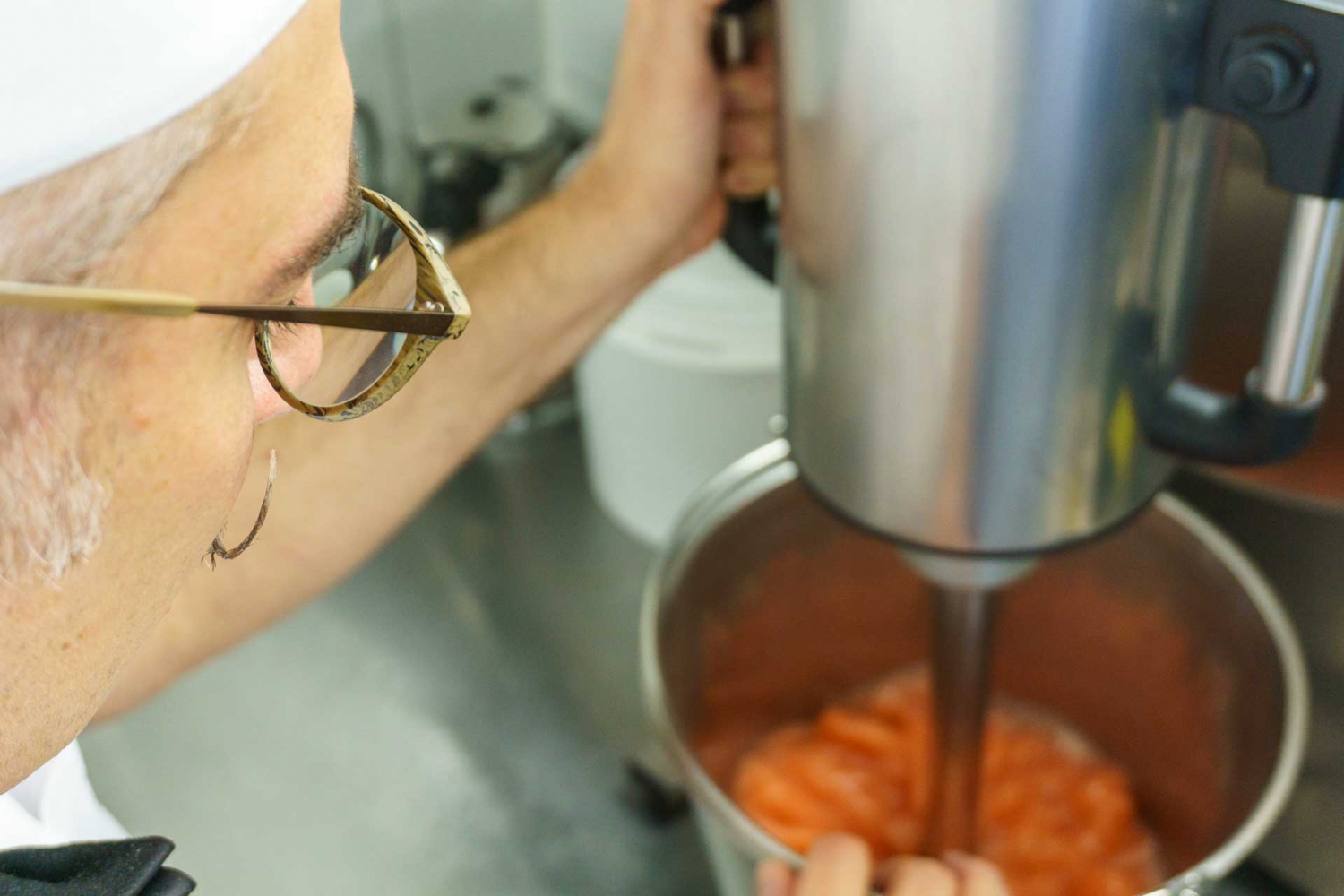 Bis sein Speiseeis „vernascht“ werden kann, sind viele Arbeitsschritte notwendig. Wer denkt, es müssten nur Milch, Sahne, Zucker und ein paar Früchte oder Aromen miteinander vermischt und dann gefroren werden, der irrt. „Ein Eis muss vollmundig, cremig, nicht zu süß, nicht zu kalt und nicht zu warm sein. Dafür braucht es neben sehr guten Zutaten, die ich vorwiegend aus regionalem und fairem Handel beziehe, auch viel Know-how“, meint der Gelatiere. Ein köstliches Eis ist echte Handarbeit: Die Zutaten müssen bis aufs Gramm genau abgewogen, die Maschinen richtig bedient und es muss streng auf Hygiene geachtet werden. Was viele nicht wissen: Die Basismasse für die verschiedenen Eissorten wird zunächst gekocht. Erst dann werden Sahne, Früchte, Schokolade oder andere Zutaten dazu gegeben und in der Eismaschine unter Rühren zu Eis gefroren. Für die perfekte Konsistenz ist vor allem der richtige Zeitpunkt entscheidend. Lässt man das Eis zu kurz in der Eismaschine gefrieren, ist es zu weich. Ist es zu lange drin, wird es zu fest.