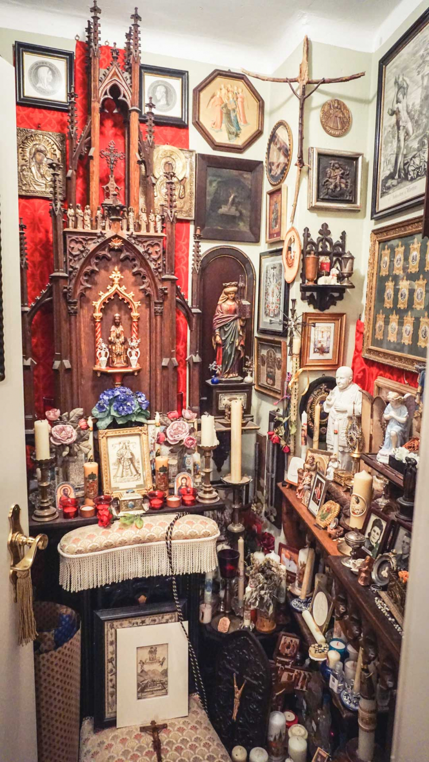 Jede Ecke in seiner Wohnung wird genutzt, auch auf und unter den Schränken liegen oder stehen gesammelte Gegenstände. Als einmal hoher Besuch aus dem Hause Wittelsbach bei ihm war, meinte dieser erstaunt: „Sie haben ja mehr von meiner Verwandtschaft hier hängen als ich zu Hause!“ Und selbst die Besenkammer hat eine viel schönere Funktion bekommen: Sie ist Jean-Louis Schlims Hauskapelle. Seine Mutter hatte ihm prophezeit, dass einmal der Tag kommen wird, an dem er sich von allem befreien muss. „Damit hat sie Recht, das könnte ich schon bringen. Manchmal wächst mir das schon alles über den Kopf.“ Trotzdem gibt es natürlich Stücke, die er nie hergeben würde. Doch es sind wenige, nur fünf, unter anderem das schöne Schutzengelmedaillon von Ludwig II., dessen Büste aus Nymphenburger Porzellan und zwei Schwäne aus Neuschwanstein und Linderhof aus dem ehemaligen Besitz des Wittelsbacher Prinzen Joseph Clemens.