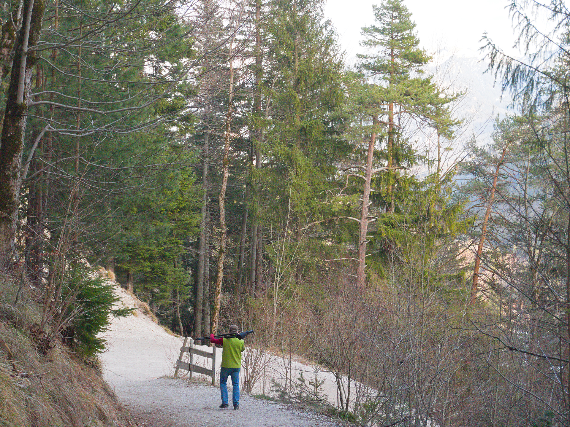 Tom möchte die neuen Winterinformationstafeln so schnell wie möglich installieren. Also fahren wir zunächst ins Achtal, das Füssens Nachbargemeinde Pfronten mit dem Tannheimer Tal verbindet.