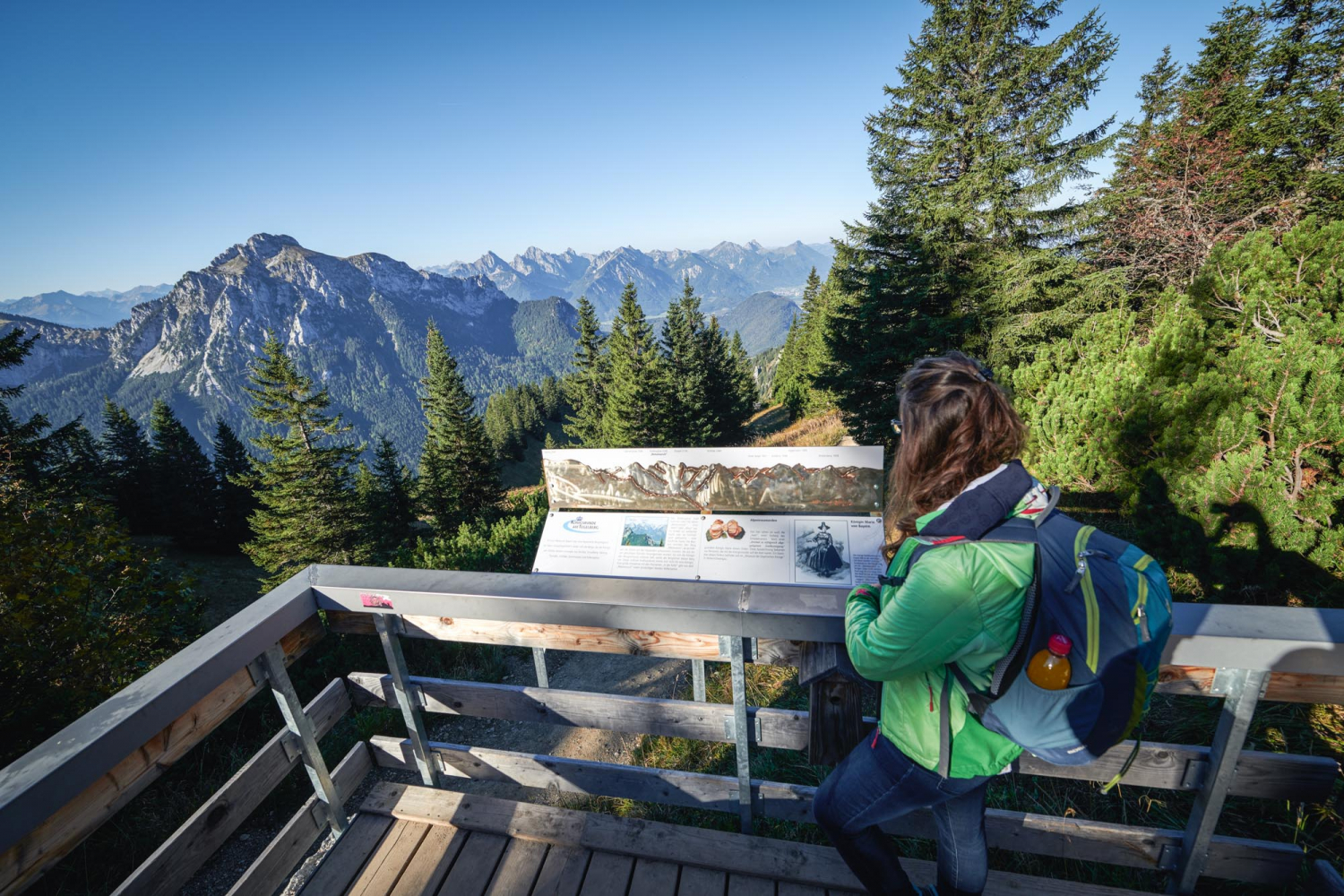 An der Infostation blickt man auf den Säuling, einer der markantesten Berge in der Region „Schlosspark im Allgäu“. Der Berg war immer wieder Wanderziel der königlichen Familie und Ludwig liebte diese Ausflüge schon als Kind – trotz der genagelten Bergschuhe, die ihm wahrscheinlich schon beim Aufstieg Bleifüße bescherten. Sein Vater König Max II. schätzte den Tegelberg als vorzügliches Jagdrevier. Deshalb ließ er sich ein Jagdhaus errichten, das heutige Tegelberghaus unterhalb der Bergstation. Auch viele Wegen durch das Ammergebirge, wie z.B. der Ahorn-Reitweg von der Bleckenau zum Tegelberg – gehen auf die Hofjagd zurück.
