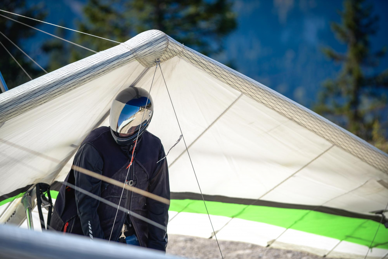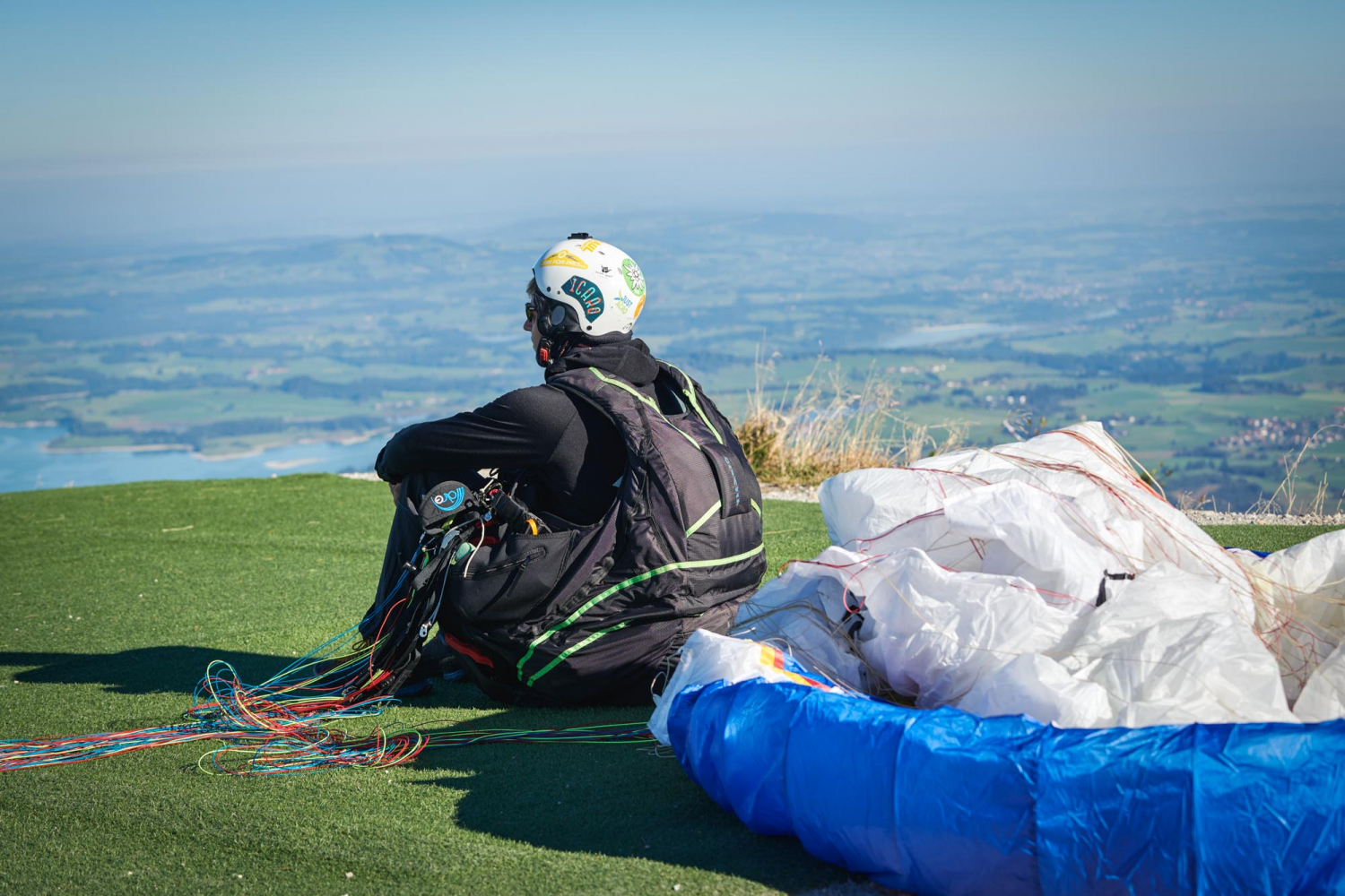 Wegen der großartigen Aussicht, ist der Tegelberg ist nicht nur bei Wanderern beliebt. Er ist auch ein Eldorado für Gleitschirm- und Drachenflieger. Manuel Hammes aus Peiting ist heute der erste Geduldige auf dem hochgelegenen Kunstrasenplatz. Fliegen, das hat ganz viel mit Warten zu tun – nämlich auf den richtigen Wind für den Start. Dieser sollte drehen, sonst wird es heute nichts. Der Schirm muss gerade über dem Flieger stehen. Doch Manuel ist zuversichtlich, dass er nachher über die Seen, Wiesen und Hügel im Schlosspark schweben wird. Er mag die grenzenlose Freiheit von oben, deshalb zieht es ihn oft hier hoch. „Es ist toll, ganz für mich zu sein. In der Luft wirken die Berge so nah, der Boden dafür ist weit weg.“ Sogar eine Alpenüberquerung hat er schon gemacht – nur mit Gleitschirm und Rucksack.