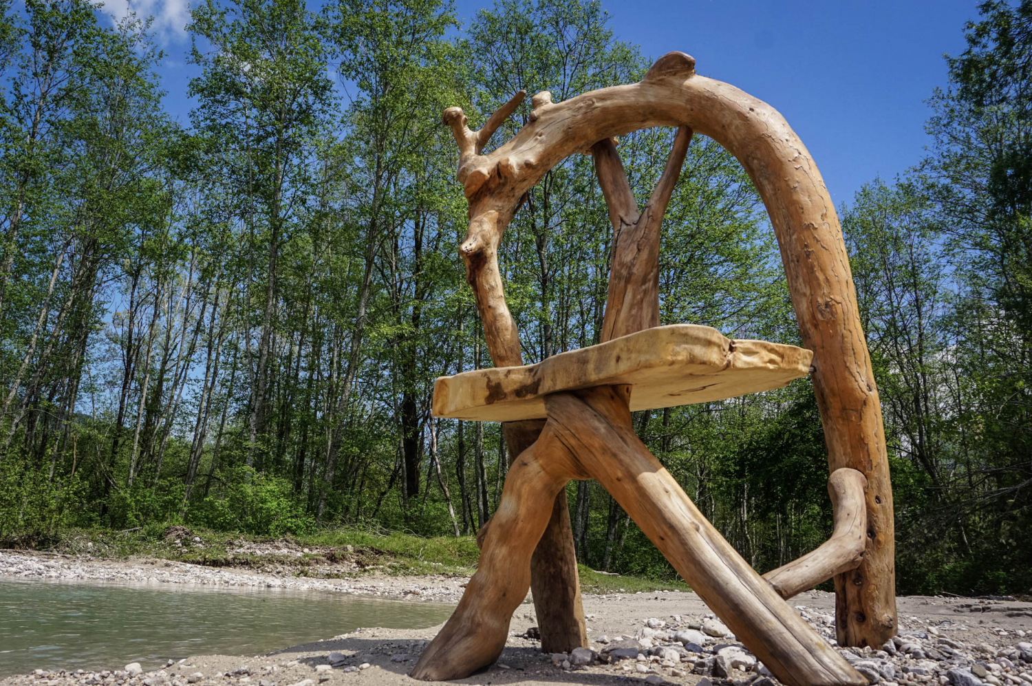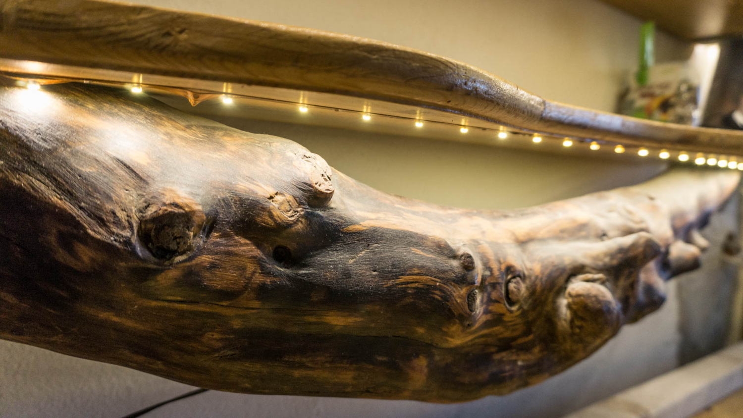 Den Fluss kannte er schon aus seiner Zeit in Augsburg, als er mit 16 Jahren eine Lehre als Parkettleger machte. Ursprünglich kommt er aus Bautzen. Die Idee, aus Schwemmholz Kunst und Möbel zu kreieren, kam ihm aber erst in Füssen. Als er 2004 hierher zog, überbrachte ihm der Lech ein Geschenk: durch das Hochwasser gab es Fußballfelder voller Schwemmholz, von dem auch noch heute einiges in seinem Fundus lagert. Hier wohnte er am Forggensee und fand eine große Wurzel, aus der dieses Küchenregal entstand. Die Initialzündung. Um mit dem Material zu experimentieren, mietete er später einen Raum in der Kunsthalle am Lech.