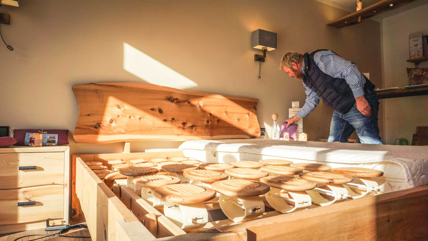 In seiner Werkstatt fertigen er und seine Mitarbeiter unter anderem Betten und Schränke aus Zirbe. Auch kleidet er immer wieder Räume komplett mit dem besonderen Holz aus. Das soll Elektrosmog abschirmen. „Schon allein der Geruch ist faszinierend und verändert die ganze Atmosphäre. Viele Gäste kennen das alpenländische Holz gar nicht und sind überrascht, wie angenehm es auf den ganzen Körper ausstrahlt.“ Für den Anfang reicht vielleicht auch erst einmal ein Kissen, das mit Zirbenholzspänen gefüllt ist. „Das Bett ist der Mercedes beim Thema Zirbe, aber schon allein ein Kissen kann den Schlaf verbessern und ist eine tolle Möglichkeit, mal zu schauen, wie das Holz auf einen wirkt.“