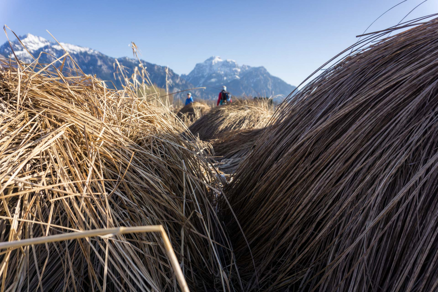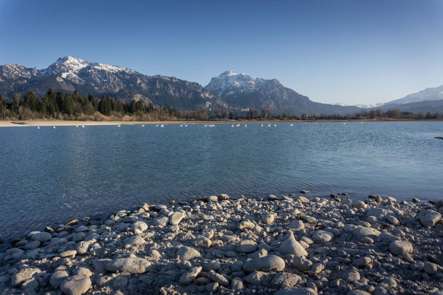 Obwohl der Seegrund so spannend ist, sollte man nicht verpassen, seinen Blick zu heben. Im Süden breitet sich die majestätische Kulisse der Tannheimer und Ammergauer Berge mit dem markanten Säuling und dem Tegelberg aus, an dessen Fuße das wohl bekannteste Märchenschloss der Welt steht: Schloss Neuschwanstein.