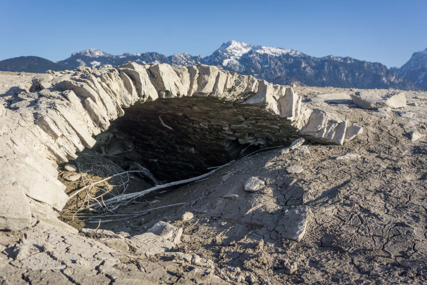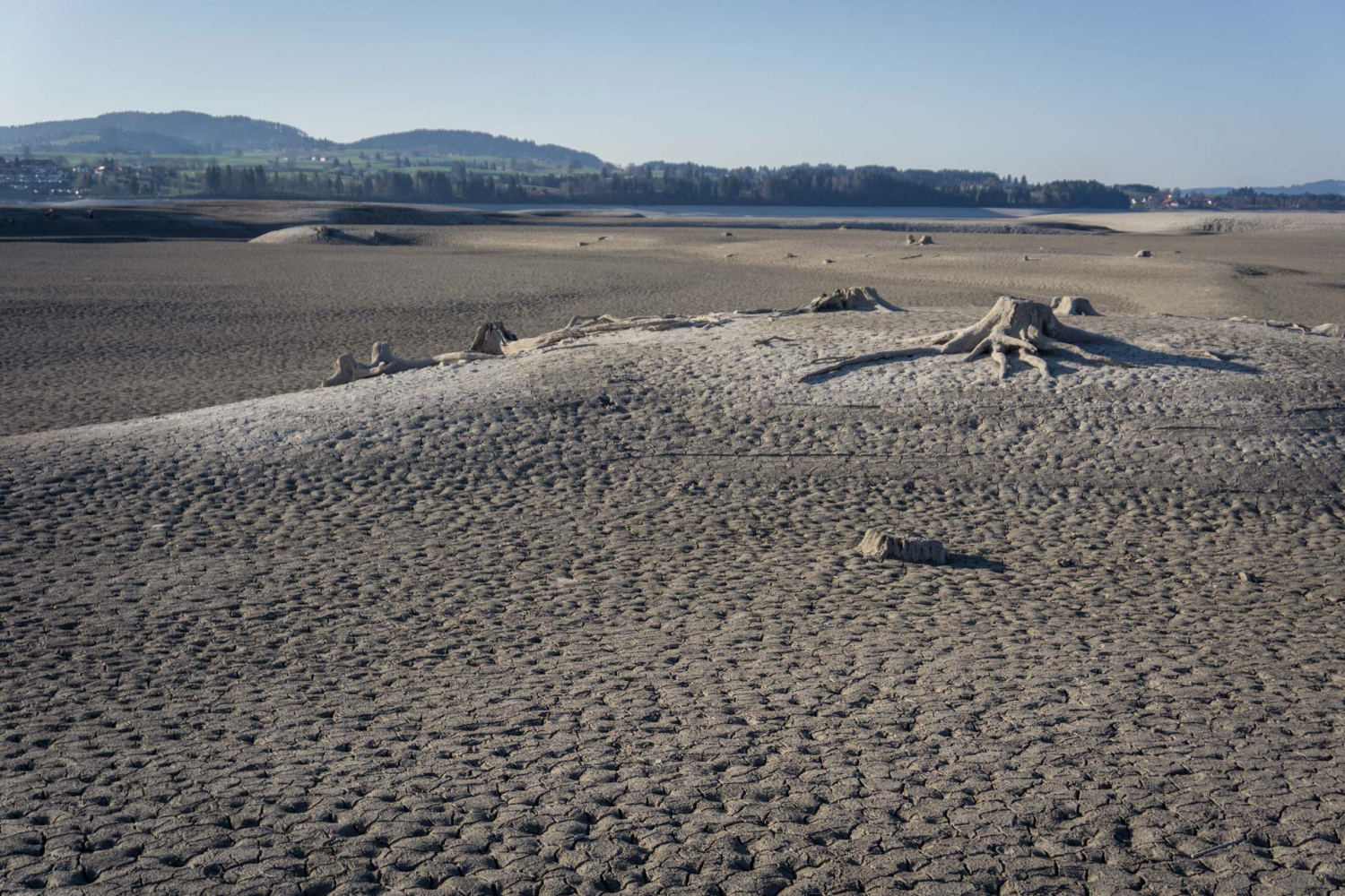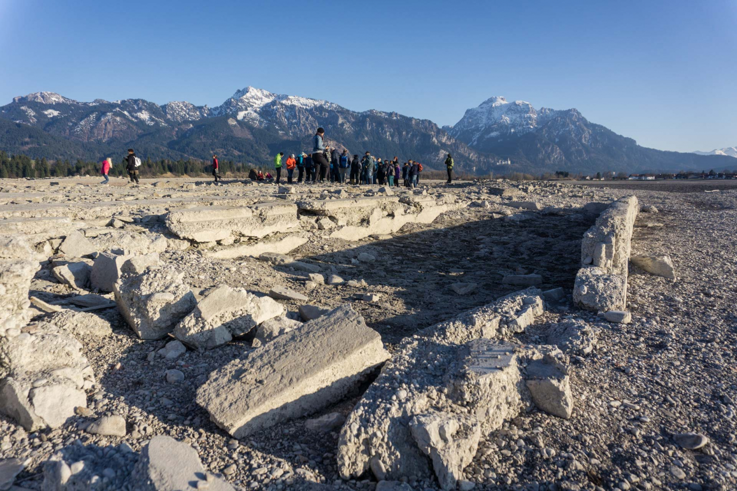 Bizarr sieht er aus. Von winzigen Kratern und Furchen durchzogen, wirkt der leere Forggensee bei Füssen wie die Oberfläche des Mondes. Mich erfasst ein bisschen Ehrfurcht, mitten durch den See gehen. Das Wasser könnte ja jederzeit zurückkommen oder etwa nicht?