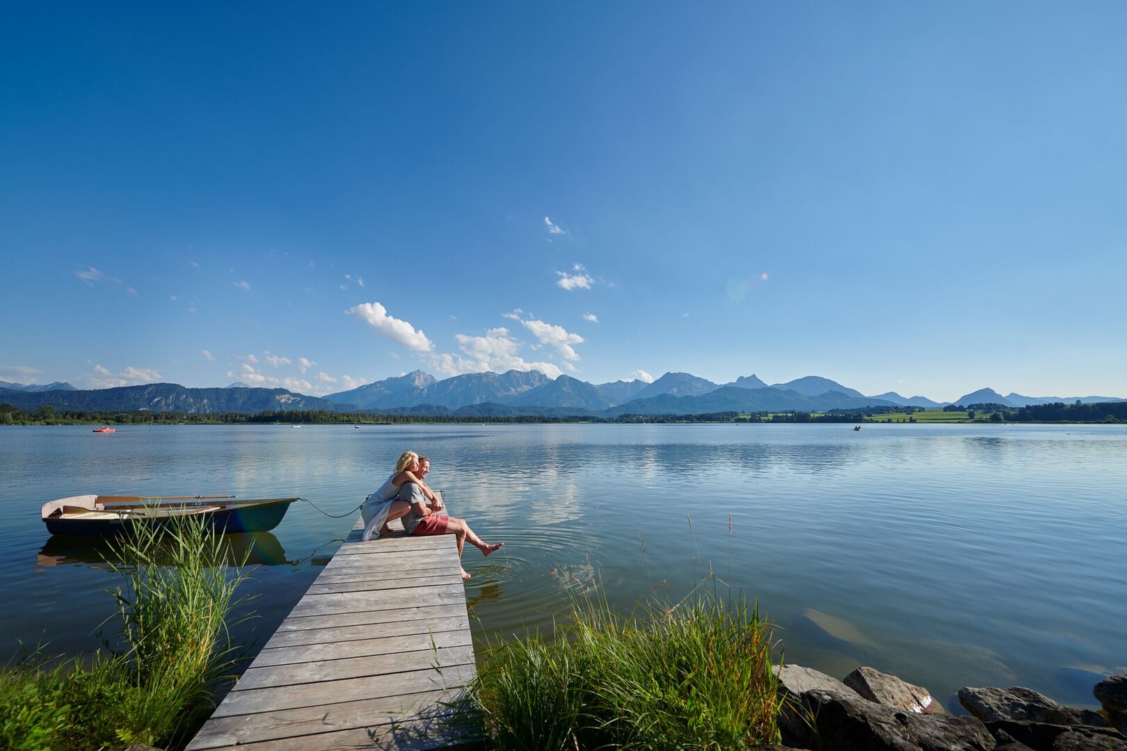 Der Hopfensee gehört zu den wärmsten bayerischen Voralpenseen. Am westlichen Ende der Uferpromenade liegt der "Seepark Hopfensee" (öffentliche Badestelle) mit großer Liegewiesen mit Baumbestand, Kinderspielplatz und Gastronomie. Egal, wie Du den Hopfensee genießt, der atemberaubende Blick auf die umliegende Bergwelt ist immer inklusive.