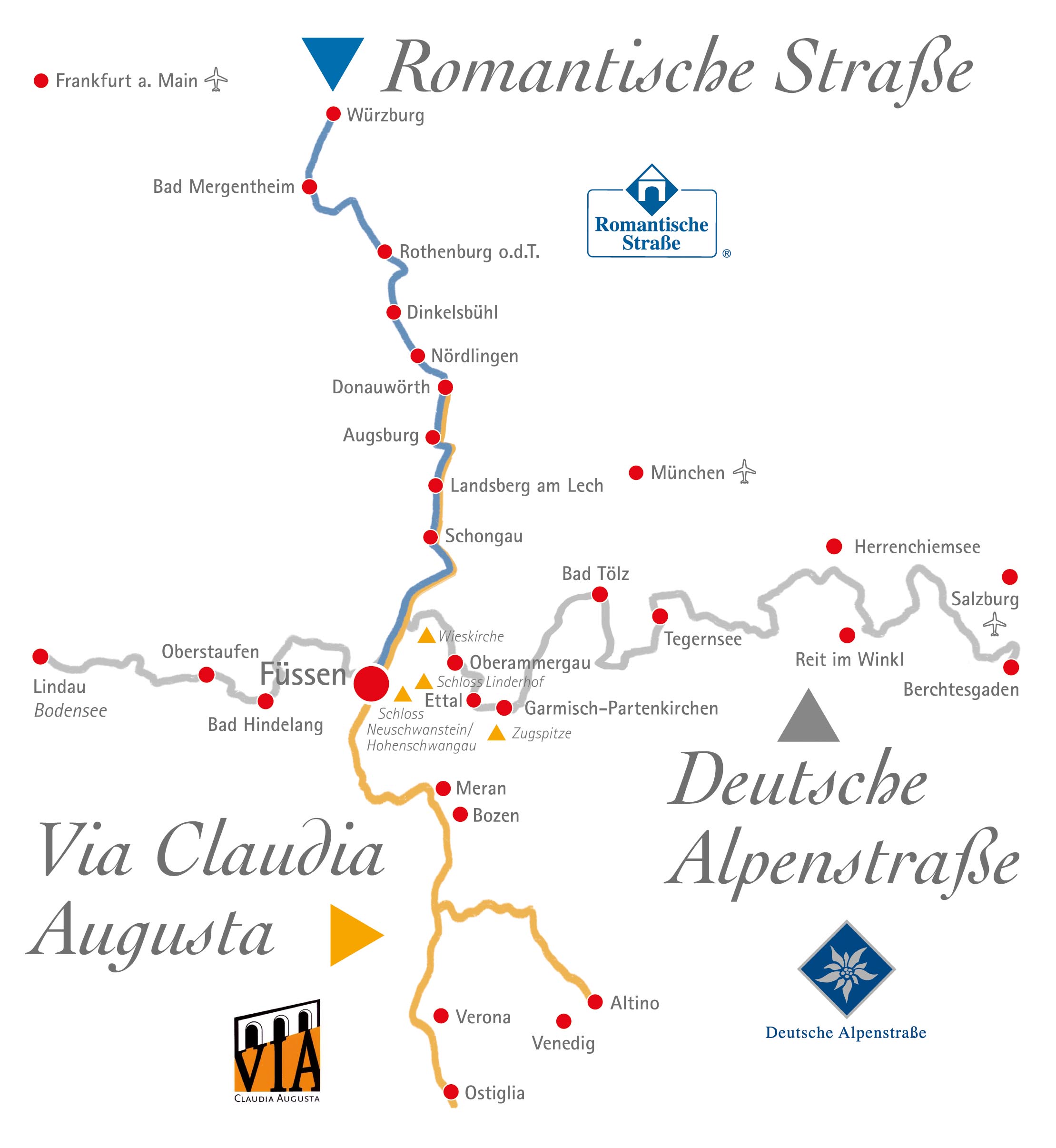 - Würzburg – Wertheim – Tauberbischofsheim – Bad Mergentheim – Rothenburg ob der Tauber – Feuchtwangen – Dinkelsbühl – Nördlingen – Harburg – Donauwörth – Augsburg – Landsberg am Lech – Schongau – Füssen