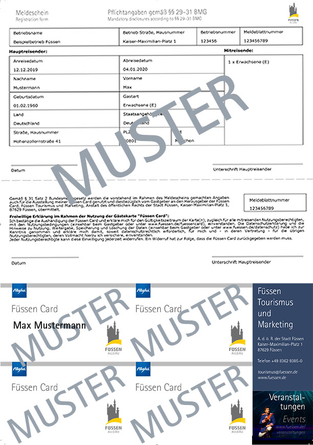 Die neue Füssen Card aus Papier wird zusammen mit dem Meldeschein auf einem Vordruck ausgedruckt. Der Ausdruck erfolgt aus dem Feratel-Meldeclient (ist Bestandteil des bekannten Webclients).