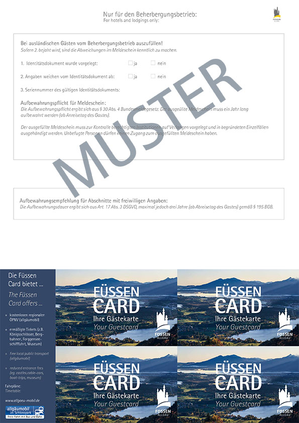 Im Zuge der verpflichtenden elektronischen Meldung fällt der bisherige vorgefertigte Papier-Meldeschein weg. Stattdessen wird der Meldeschein zusammen mit der Gästekarte (Füssen Card) auf einem Papier-Vordruck beim Gastgeber ausgedruckt. Die Gästekarte muss nicht separat pro Gast freigeschaltet werden. Den Vordruck erhalten Gastgeber kostenlos von FTM. Für den Druck eignet sich jeder handelsübliche A4-Drucker (schwarz-weiß). Es wird lediglich die Vorderseite des Vordrucks bedruckt.