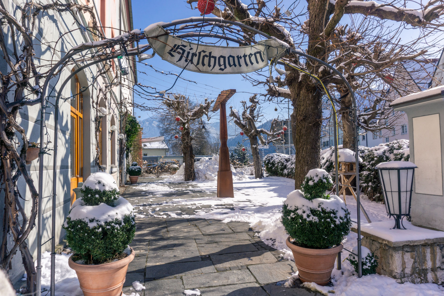 Ein beliebtes Motiv, das sich im Hotel in den verschiedensten Variationen findet, ist natürlich der Hirsch. Ob in Gemälden, Dekorationen oder in der Lüftungsabdeckung der Heizung, er ist überall präsent. „Der Name des Hotels, den es ja sehr häufig gibt, leitet sich generell von einem 200 Liter-Fass Bier ab. Es wird als „Hirschen“ bezeichnet“, erklärt Harald Schwecke. „’Zum Hirschen gehen‘ heißt also, ein Bier trinken zu gehen.“ Das gute Bier ist neben der gehobenen, regionalen Küche ein weiterer Grund, warum auch viele Einheimische gerne ins Restaurant, in die Bierstube und den Hirschgarten kommen, der derzeit im Winterschlaf liegt.