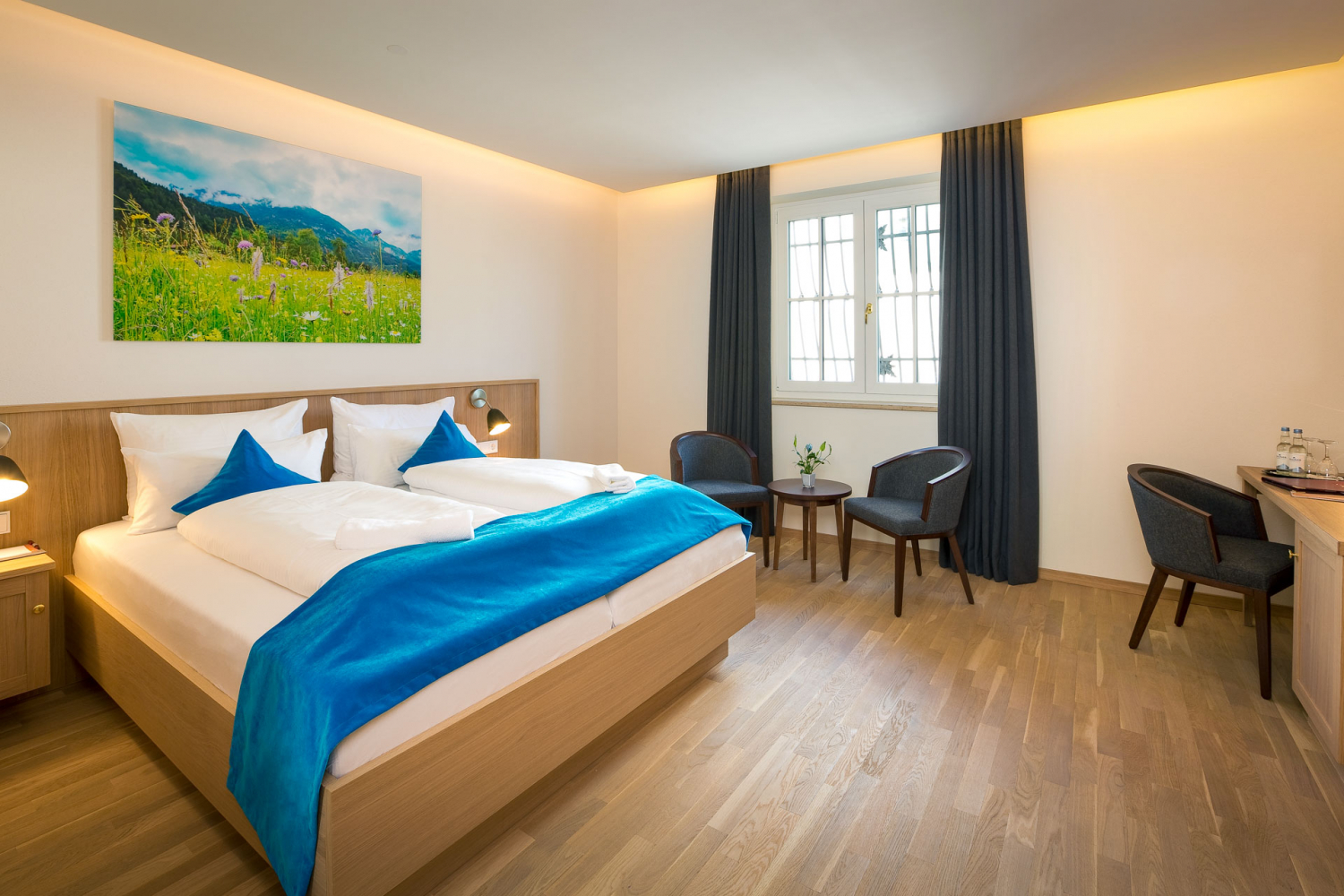 Wer das Hotel betritt, spürt und sieht sofort, dass es einen ganz individuellen Charakter hat. Ein Haus mit Persönlichkeit, die in über 100 Jahren gewachsen ist. Jede Generation hat ihre Spuren, ihre Abdrücke hinterlassen. Das ist in den vielen Ecken, Winkeln und Gängen und natürlich in den 71 Zimmern sichtbar. Im Stammhaus ist jedes Zimmer einem wichtigen Thema oder einer Person aus Füssen und der Umgebung gewidmet, z.B. dem Hohen Schloss. Im gleichnamigen Motivzimmer sind u.a. Nachbildungen von historisch wertvollen Glasmalereien zwischen Bad und Wohnraum eingearbeitet. Weitere Zimmer spiegeln die Geschichte des Füssener Geigenbaus mit einem „Himmel voller Geigen“ oder sie zeigen den Lech, Spuren der Via Claudia Augusta – und natürlich Märchenkönig König Ludwig II. Ein Gästezimmer „gehört“ aber auch schlicht den schönen Füssnerinnen. Eine Wand ist deshalb mit Porträts von Frauen aus der Stadt dekoriert. Von vielen Zimmern hat man einen tollen Blick auf die Altstadt und die Bergkulisse mit dem markanten Hausberg von Füssen, dem Säuling, der ebenfalls Leitmotiv eines Gästezimmers ist.