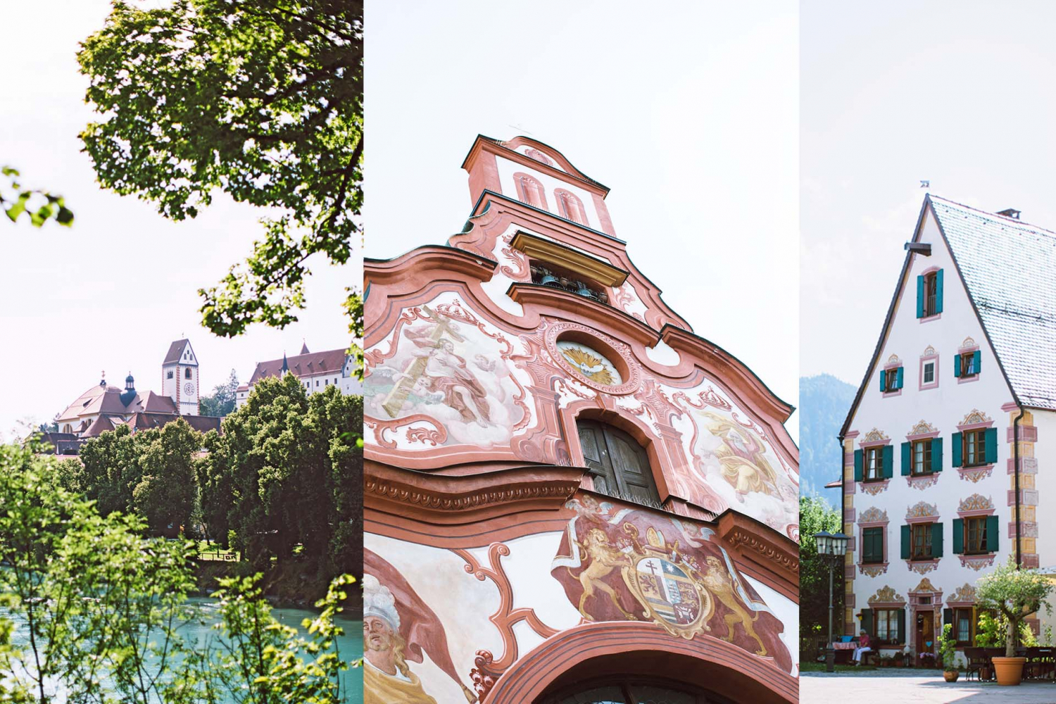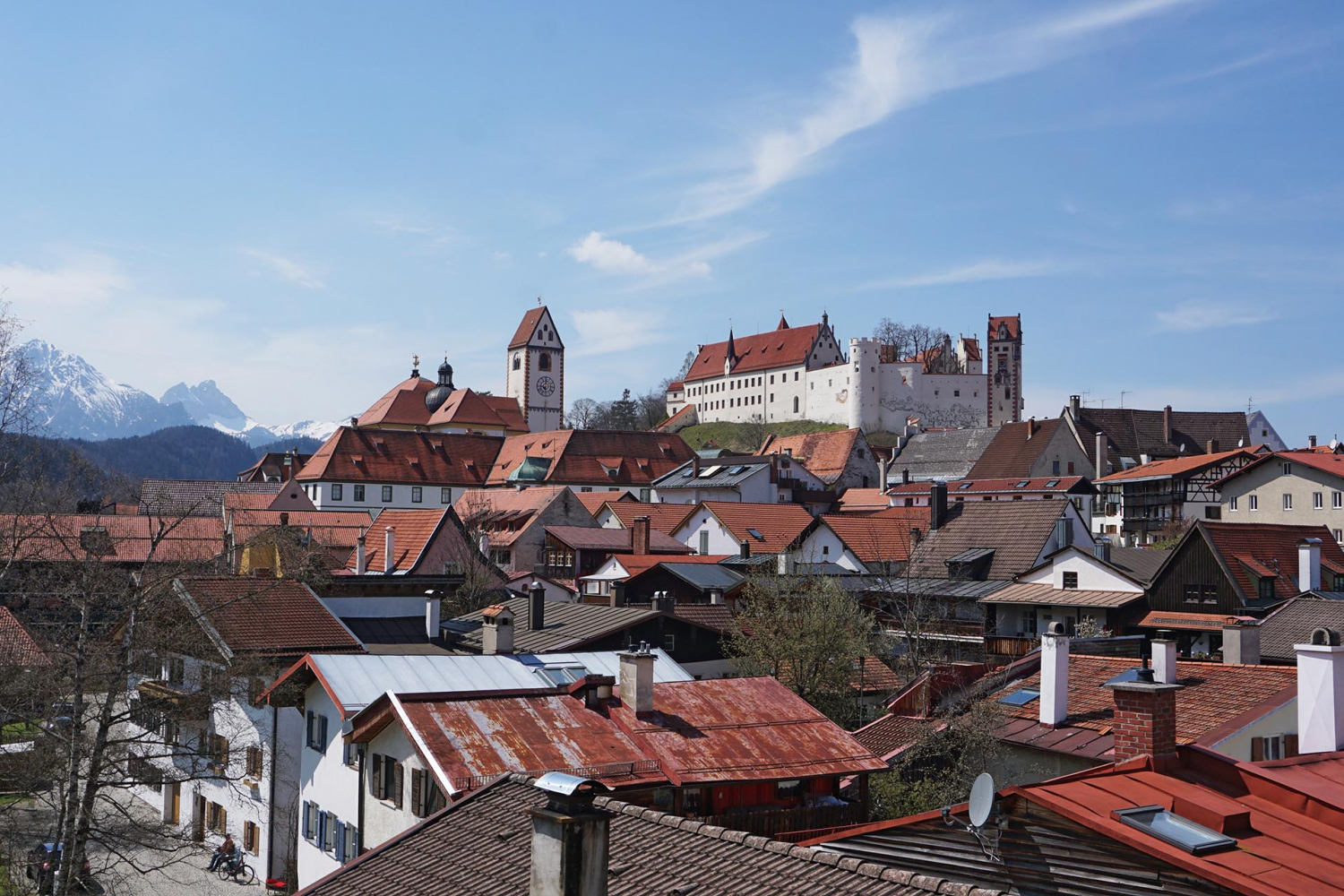 Was für ein Ausblick! Wer vom Franziskanerkloster aus auf die pittoreske Stadt schaut, unternimmt eine Zeitreise – mitten hinein ins Mittelalter. Auf dem Höhenzug thront die Sommerresidenz der Fürstbischöfe von Augsburg, das Hohe Schloss. Links ist das ehemalige Benediktinerkloster Sankt Mang zu sehen, das mehr als 1000 Jahre nicht nur das religiöse, sondern auch das wirtschaftliche und kulturelle Zentrum der ganzen Region war. Unten reihen und schmiegen sich Häuser mit steilen, gotischen Giebeln um die imposanten Bauten. Auch wenn es heute so aussieht, als ob Füssen als Gesamtkunstwerk am Reißbrett geplant wurde, wuchs dieses mittelalterliche Ensemble über die Jahrhunderte zu seiner imposanten Erscheinung heran. Es macht Spaß, in die Architektur der Altstadt einzutauchen und nicht „nur“ zu flanieren, die Auslagen in den Geschäften zu betrachten oder die manchmal fast mediterrane Atmosphäre zu genießen. Wer beim Spaziergang den Kopf in den Nacken legt, in Seitengassen einbiegt und sich Aussichtsplätze über die Stadt erobert, wird Besonderes und Überraschendes entdecken.