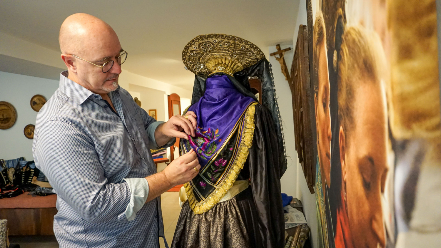 Durch Zufall entdeckte er im Füssener Stadt-Café drei Holztafeln mit Motiven in historischer Tracht um 1850 und bekam bald darauf aus einer Haushaltsauflösung 12 Hauben, Tücher und Mieder – sein Grundstock für weitere Recherchen. Damit holte er auch Mitglieder in den Verein, die mit Gewand und Tanz eigentlich nicht so viel anfangen können, sich aber für die geschichtlichen Hintergründe interessieren. Langsam machte es die Runde, was der Füssener suchte: neben typisch schwäbisch-allgäuerischer Trachtenkleidung auch Gemälde, Fotos und Aufzeichnungen zum Thema Tracht. Nach Zeitdokumenten aus der Biedermeierzeit forscht er bis heute ganz besonders. „Manche werfen solche Sachen ja einfach weg, weil sie nicht wissen, dass es ein historisches Vermächtnis sein könnte. Ich will ein Bewusstsein für solche Werte wecken.“ So rufen mittlerweile immer mehr Menschen an und bringen ihm Sachen vorbei. Auf Flohmärkten sucht er außerdem nach besonderen Knöpfen und Hutbroschen.