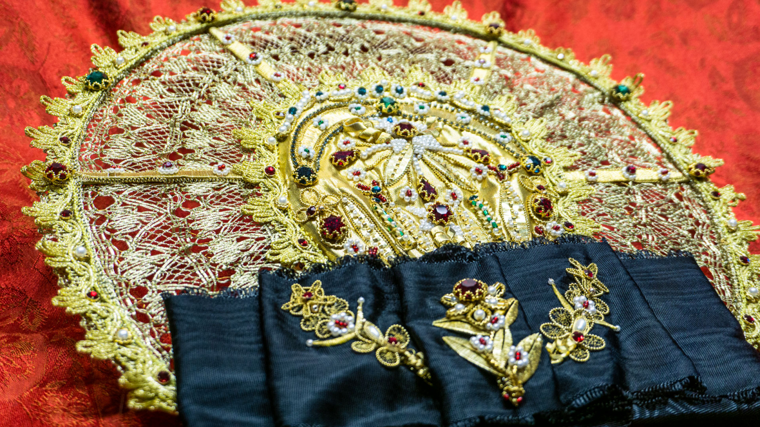 Für ein einziges Blumenblatt braucht sie ca. 10 Minuten, insgesamt also über drei Stunden für eine Silberdistel. So nutzt Petra Bayer jede freie Minute und wickelt eigentlich überall, auch im Wartezimmer beim Arzt. „Meine Mama hat mich mal gefragt, warum ich das eigentlich mache. Ich bekomme damit den Kopf frei, das hat etwas Meditatives. Wenn ich mich damit am Abend hinsetze, kann ich wirklich abschalten und den Alltag hinter mir lassen.“ Ihre Mutter wickelte bald darauf mit gleicher Begeisterung „Seelchen“ für Klosterarbeiten. Für ihre feinen Kunstwerke verwenden die beiden echt vergoldete oder versilberte Materialien, Perlen, Kristalle und Halbedelsteine. Es braucht handwerkliches Geschick und Kreativität, um später die vielen Einzelstücke für eine Haube zu einem prachtvollen Gesamtbild zu kombinieren. „Oft weiß man erst hinterher, wie sie komplett aussieht und jedes Modell wird perfekter und schöner.“