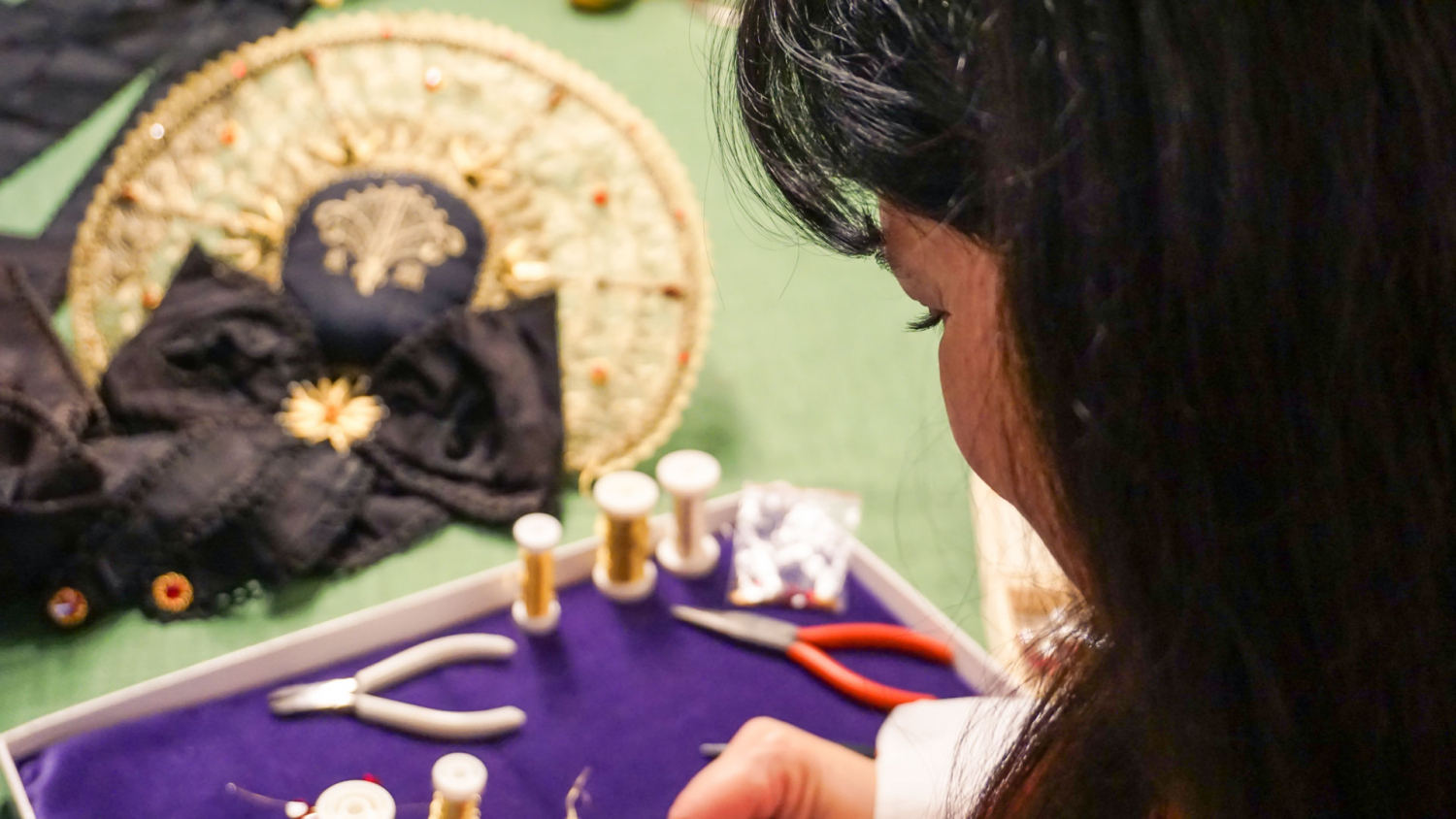 Petra Bayer weiß warum: Es ist eine unglaublich aufwändige Arbeit. Die Kosmetikerin aus Trauchgau ist begeisterte Trachtlerin und fertigt seit über 30 Jahren Klosterarbeiten, ein filigranes Kunsthandwerk. Vor zwei Jahren besuchte sie einen Haubenkurs bei der Trachtenkultur-Beratung des Bezirks Schwaben, weil sie gerne etwas „Alt-Handwerkliches“ machen wollte. Seitdem experimentiert sie mit Formen und Farben und lässt sich dabei u.a. von Reliquienbildern, Blüten in der Natur oder sogar Formen von alten Fassaden mit Stuckornamenten inspirieren. Dann zeichnet sie ihre Ideen auf und macht daraus eine Vorlage aus Karton, anhand der sie Silber- oder Goldfolie ausschneidet. Diese wird dann zunächst mit feinstem Draht umwickelt.