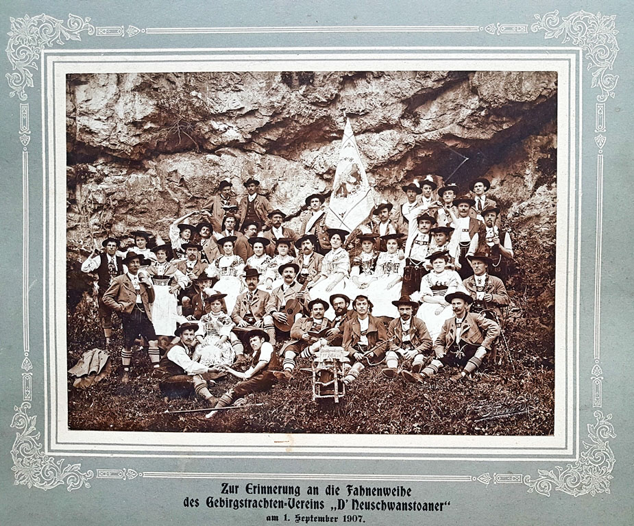 In der sogenannten „Gifthütte“, dem Wirtshaus „Zum Mineralbad“ auf dem Gelände der Hanfwerke, tanzten und musizierten sie miteinander und gründeten zusammen mit Einheimischen am 17.11.1900 den Ur-Verein „Alpenclub Edelweiss und Almenrausch“, um „Sitten und Trachten unserer Alpen für unsere jugendlichen Touristen zu verbreiten“. Mit dem Ausdruck „Touristen“ waren in diesem Fall die Fabrikarbeiter gemeint, diese waren die Impulsgeber für die Region. Nach Füssen wurden auch in Trauchgau und Buching Trachtenvereine gegründet. Bereits fünf Jahre später wurde der Füssener Verein in „Gebirgstrachten-Vereinigung D’Neuschwanstoaner Füssen“ umbenannt, denn man wollte eine örtliche Zuordnung im Namen tragen. Das schon damals bekannte Märchenschloss Neuschwanstein, das Bayernkönig Ludwig II. vor den Toren Füssens in traumhafter Naturkulisse errichtete, war als „Alleinstellungsmerkmal“ dafür bestens geeignet. Den Namenszusatz „Stamm“ trägt der Verein seit 1912, was bedeutet, dass dieser Verein der Stammbaum ist, von dem sinnbildlich an den Ästen weitere Trachtenvereine abstammen.