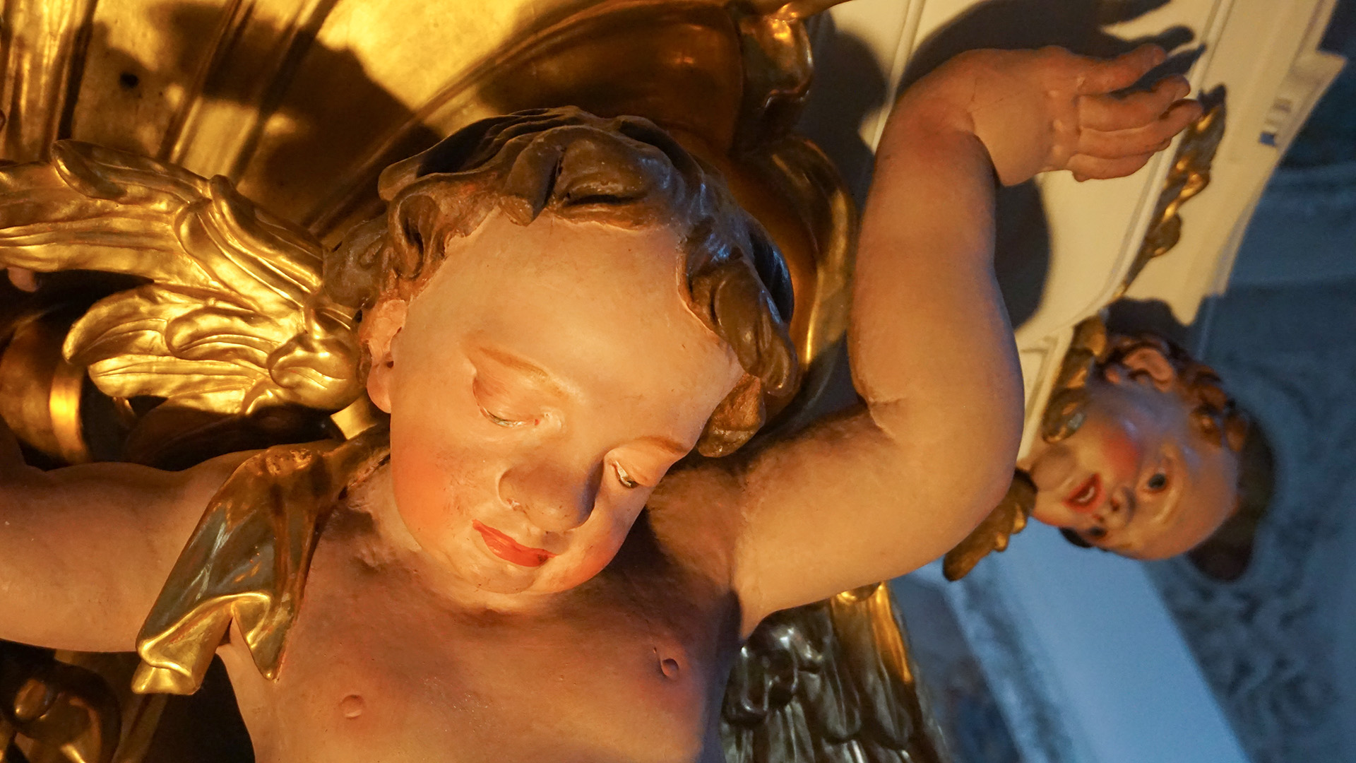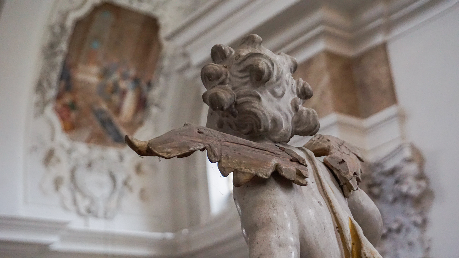 Die Zeit ist auch an diesen Putten nicht spurlos vorbei gegangen und sie haben über die Jahrhunderte die ein oder andere Blessur abbekommen. Wie im Barock üblich, stehen alle Kunstwerke – egal ob Gemälde, Fresko oder Skulptur – in diesem Raum miteinander in Verbindung und so verweisen manche der kleinkindähnlichen Putten auch auf das Kuppelfresko mit den Allegorien der Göttlichen Weisheit, Klugheit, Wahrheit und Erkenntnis sowie auf den Klosterbegründer und Schutzpatron des Allgäus, den heiligen Magnus.