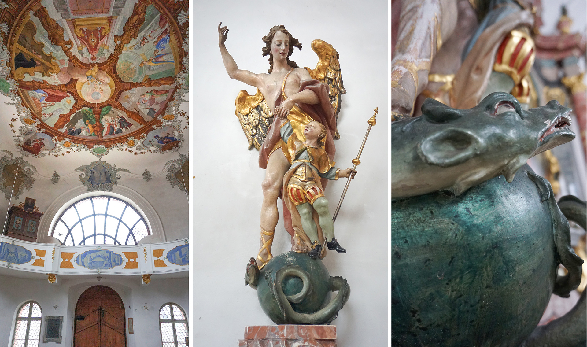 Nicht immer aber buhlen die Engel um Gottes Gunst und werden als seine Botschafter lieb, nett und freundlich dargestellt. Links und rechts vor dem Altarraum stehen zwei Luzifer-Leuchter. Luzifer, in der Mythologie des antiken Judentums der „gefallene“ und aus dem Himmel verbannte Engel, ist hier jeweils als Drache dargestellt. „Die Drachen symbolisieren das Böse, doch tragen sie eine Kerze, die für den Glauben und die Gotteswärme steht. Das kann man so interpretieren, dass der heilige Magnus mit dem Christentum das Licht in diese ungläubige Gegend gebracht hat und das Böse jetzt dem Guten dient„, erklärt Bruno Ehrentreich. Einer der Luzifer-Leuchter durfte für eine Engelausstellung auch schon nach Freising auf den Domberg reisen und war dort wohl das Glanzlicht. Die Leuchter sind ebenfalls von einem Füssener geschaffen worden: Thomas Seitz fertigte sie 1723 im damaligen Faulenbach.