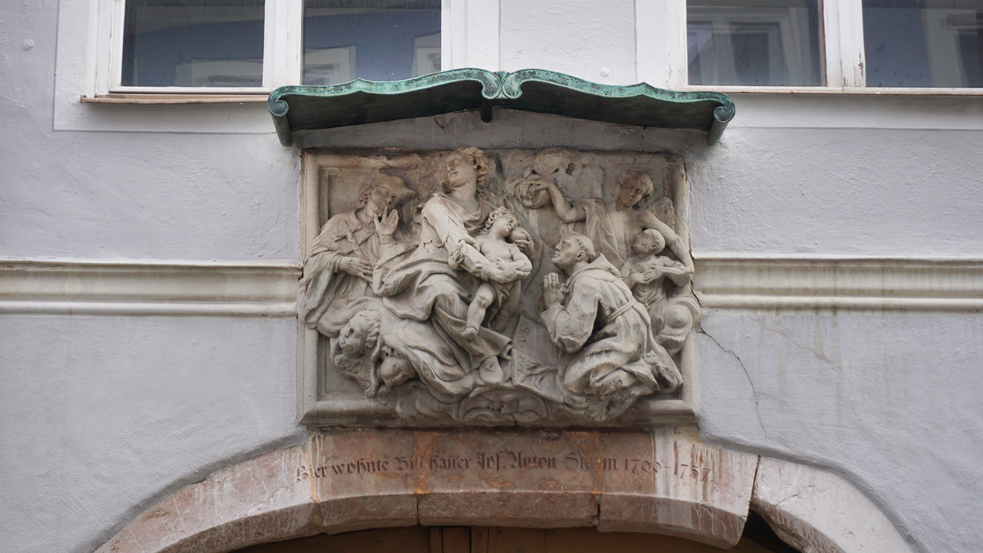 Ein besonders schönes Steinrelief ist am Wohnhaus des Bildhauers Anton Sturm in der Brunnengasse erhalten. Als Marienverehrer hat er darauf Madonna mit dem Jesuskind verewigt, flankiert von Nepomuk – ein „Modeheiliger“, im Barock in Bayern recht populär wurde – und dem heiligen Antonius als Namenspatron des Künstlers. Rechts oben wacht wie in der Spitalkirche der Erzengel Raphael über den jungen Tobias.