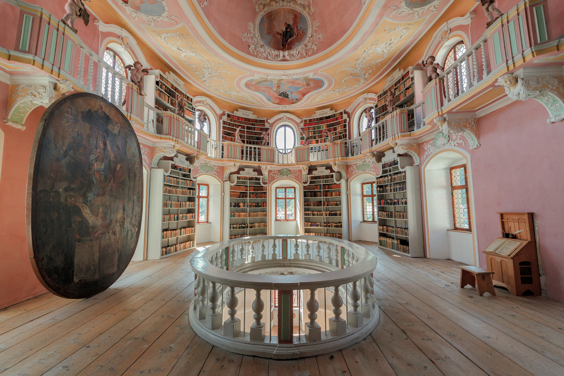Auch wenn der originale Buchbestand im Zuge der Säkularisation aus den Regalen verschwand, hat die Klosterbibliothek nichts an ihrer Pracht eingebüßt. Überraschend sind neben dem ovalen Grundriss die hohe Kuppel und die ebenfalls ovale Öffnung in der Mitte, durch die der darunter liegende, eher schlicht gehaltene Speisesaal (Refektorium) zu sehen ist. Vermutlich wollte Johann Jakob Herkomer mit seiner ungewöhnlichen architektonischen Konzeption die Einheit von leiblicher und geistiger Nahrung versinnbildlichen, wobei er letztere mit der prachtvollen Gestaltung des Raumes unverkennbar betonte.