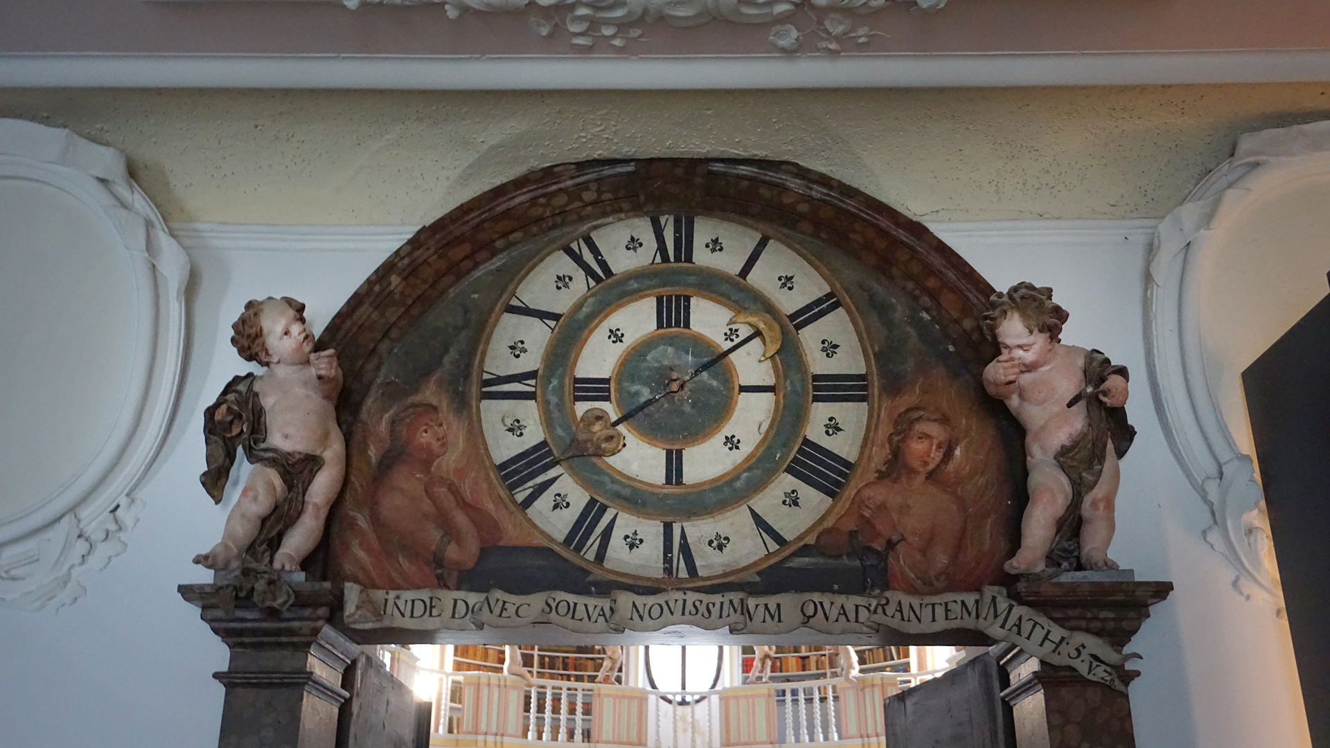 Über dem Eingangsportal zur Klosterbibliothek ist ein von weiteren Putten gerahmtes Wunderwerk zu sehen – wenngleich diese Uhr heute nicht mehr funktionstüchtig ist, weil die ausgeklügelte Mechanik des Uhrwerks während der Säkularisation ausgebaut wurde. Ursprünglich haben die Puttenpaare rechts und links der Türen zur Bibliothek und auch zum Refektorium ein Stockwerk tiefer die Viertelstunden und vollen Stunden geschlagen.