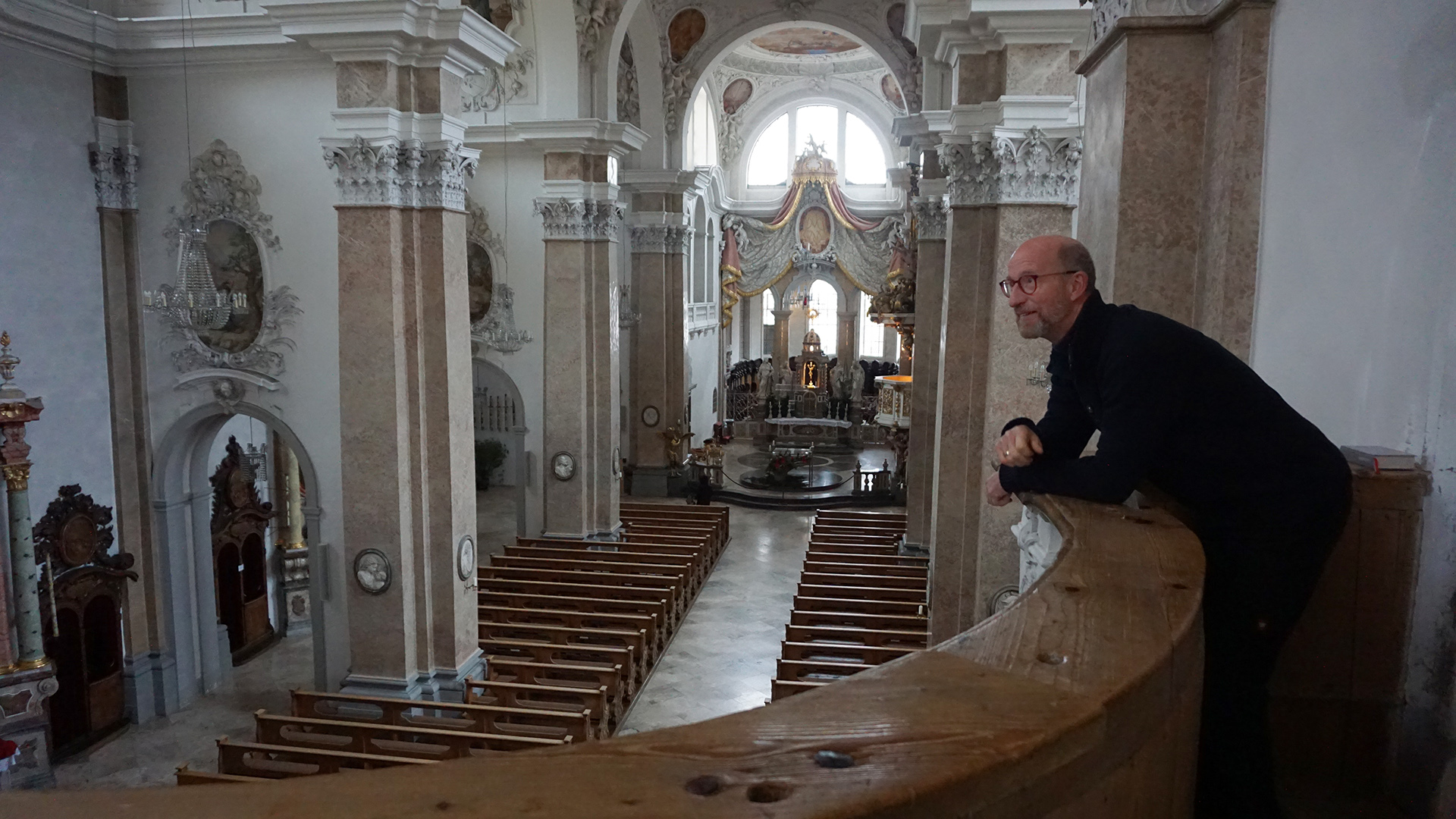 „Schwierig abzuschätzen. Schreiben Sie am besten unzählige Engel„, meint Bruno Ehrentreich lachend auf die Frage, wie viele von den himmlischen Boten in der prachtvollsten der Füssener Barockkirchen wohnen. Engel und Putten stecken hier im Stuck, in Säulenreliefs, halten Kerzen oder schmiegen sich in Fresken und Gemälden um Wolken und Heilige. „Wer nur flüchtig drüber schaut, wird nicht bemerken, dass sie eigentlich überall sind.“