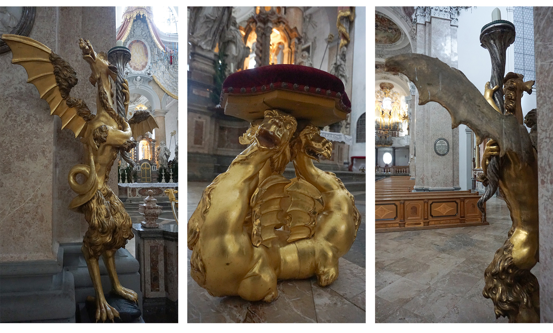 Nicht immer aber buhlen die Engel um Gottes Gunst und werden als seine Botschafter lieb, nett und freundlich dargestellt. Links und rechts vor dem Altarraum stehen zwei Luzifer-Leuchter. Luzifer, in der Mythologie des antiken Judentums der „gefallene“ und aus dem Himmel verbannte Engel, ist hier jeweils als Drache dargestellt. „Die Drachen symbolisieren das Böse, doch tragen sie eine Kerze, die für den Glauben und die Gotteswärme steht. Das kann man so interpretieren, dass der heilige Magnus mit dem Christentum das Licht in diese ungläubige Gegend gebracht hat und das Böse jetzt dem Guten dient„, erklärt Bruno Ehrentreich. Einer der Luzifer-Leuchter durfte für eine Engelausstellung auch schon nach Freising auf den Domberg reisen und war dort wohl das Glanzlicht. Die Leuchter sind ebenfalls von einem Füssener geschaffen worden: Thomas Seitz fertigte sie 1723 im damaligen Faulenbach.