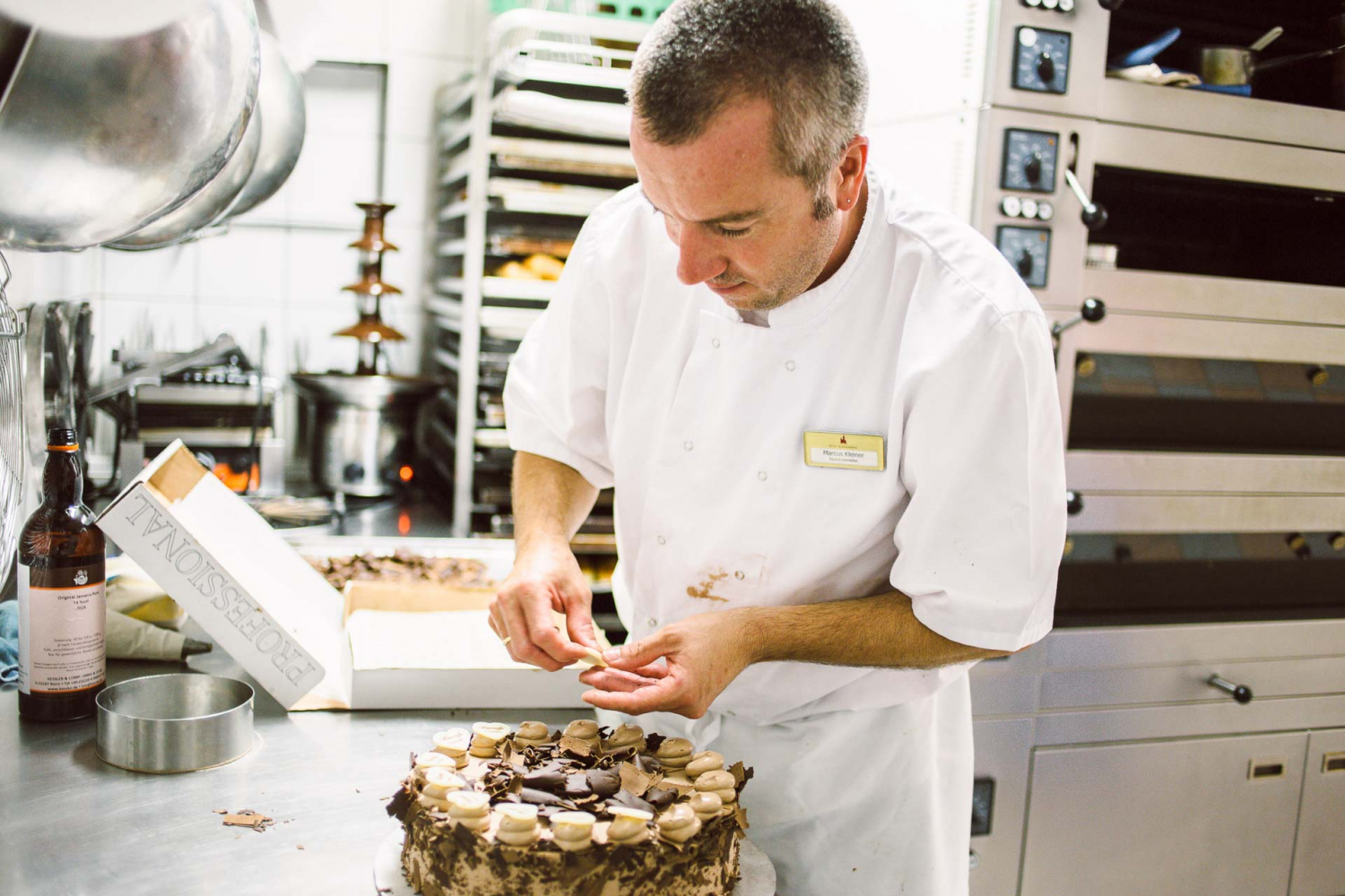 Genaueres verrät mir Konditormeister Markus Kleiner nicht, aber ich darf zuschauen. Was für ein Glück, aber auch höchst gefährlich, denn am liebsten würde ich mich mit in der Rum-Trüffel-Creme und den kandierten Veilchen irgendwo einschließen und erst wieder rauskommen, wenn alles verputzt ist. Zwischen die Kakaoböden wird Buttercreme geschichtet und mit hauchdünnen Schokoladenspänen überzogen. Am Schluss wird das Werk mit Veilchen und dem Konterfrei der Kaiserin auf weißer Schokolade verziert. Herrlich!