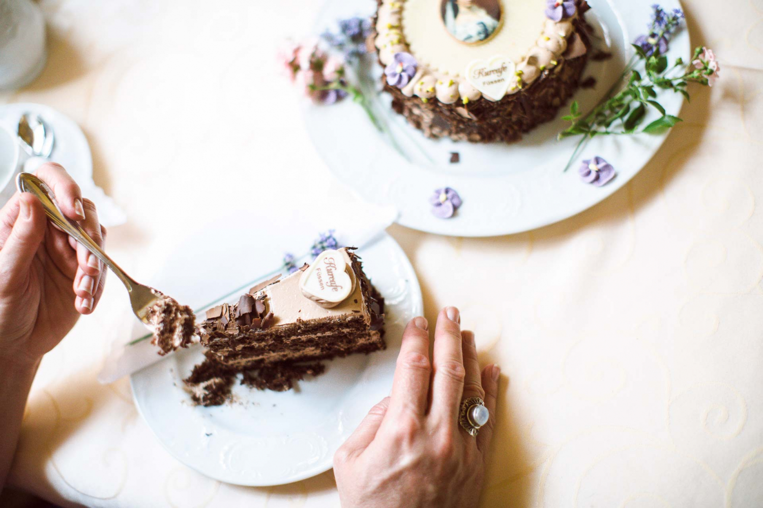 Okay, zugegeben, wenn man ein Stück von dieser Köstlichkeit gegessen hat, schwebt man nicht unbedingt, man bekommt eher mehr Bodenhaftung. Aber die Sissi-Torte ist definitiv eine Sünde wert. Kaum zu glauben, dass ausgerechnet die figurbewusste österreichische Kaiserin Elisabeth, Lieblingscousine von Märchenkönig Ludwig II., diese Kalorienbombe in dem Café gegessen haben soll. Denn zeitgenössischen Berichten zufolge hungerte sie, machte ausdauernde Turnübungen und trank den ausgepressten Saft von Rind- und Kalbsfleisch, um das Altern zu stoppen. Aber: Tatsächlich sagt man ihr auch nach, dass sie eine Schwäche für Süßes hatte, vor allem für kandierte Veilchen.