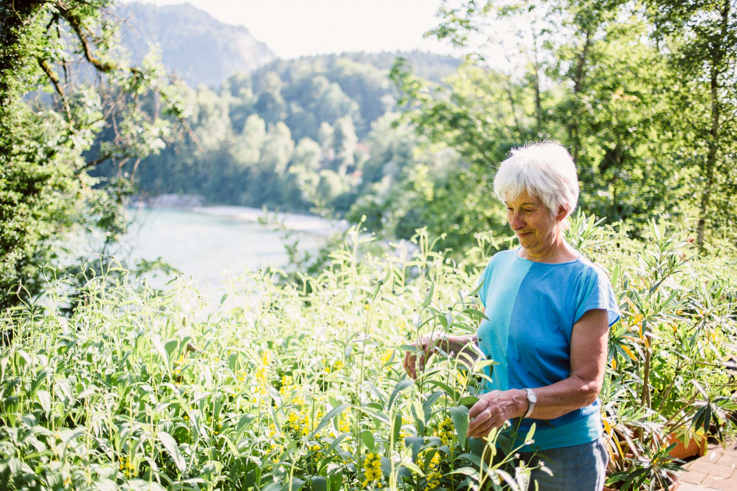 Von der Spitalkirche sind es nur wenige Meter zum Lechufer. Ich schlendere das Faulenbachgässchen entlang. Die Füssener haben eine ganz besondere Beziehung zu „ihrem“ letzten Wilden, dem Lech, das hab ich schon oft in Gesprächen bemerkt. Zum Beispiel mit Getrud Hehl, die seit 1963 im Faulenbachgässchen wohnt und von dort direkt zur Lechschlucht blicken kann. Wir kommen ins Gespräch. Sie erzählt mir, wie sehr sie den Fluss mag: „Man lebt mit ihm. Seine Stimmungen sind jeden Tag anders, so wie der Sonnenauf- und -untergang auch nie gleich sind. Wenn’s in Österreich ein starkes Gewitter hatte, dann kommt er hier statt grün sogar schlammbraun an.“ Getrud Hehl pflegt besondere Schätze entlang des Weges, wie zum Beispiel den Bildstock mit einer Skulptur des Schmerzensmannes aus dem 17. Jahrhundert oder die Grotte, in der Maria in einer Felsnische steht – davor eine kleine Bank geschützt hinter Buchs und Lebensbaum. Eine andere Welt, nur ein paar Schritte vom Fluss entfernt.